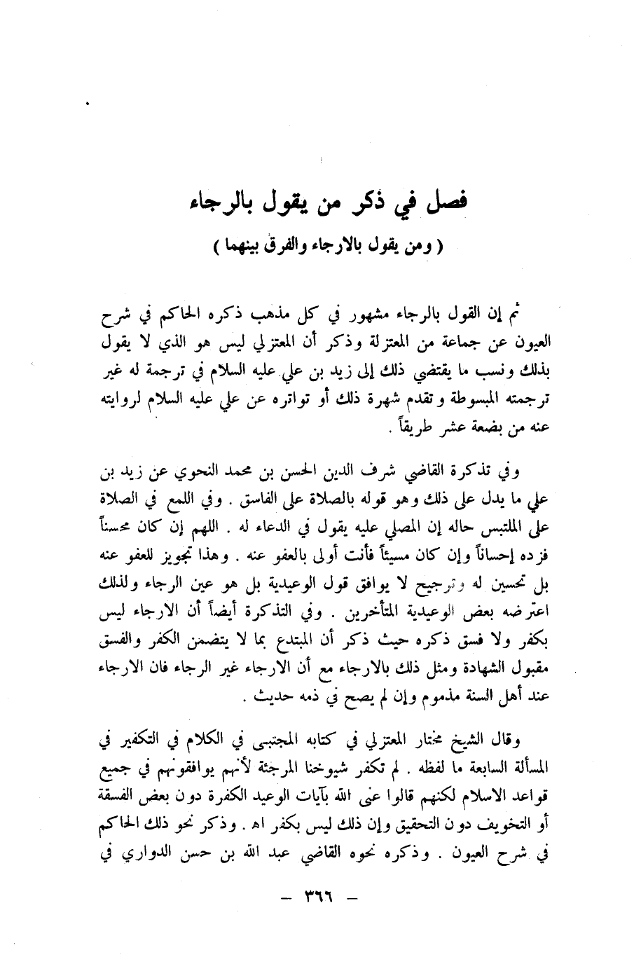 ثمَّ إِن القَوْل بالرجاء مَشْهُور فِي كل مَذْهَب ذكره الْحَاكِم فِي شرح الْعُيُون عَن جمَاعَة من الْمُعْتَزلَة وَذكر أَن المعتزلي لَيْسَ هُوَ الَّذِي لَا يَقُول بذلك وَنسب مَا يَقْتَضِي ذَلِك إِلَى زيد بن عَليّ عَلَيْهِ السَّلَام فِي تَرْجَمَة لَهُ غير تَرْجَمته المبسوطة وَتقدم شهرة ذَلِك أَو تواتره عَن عَليّ عَلَيْهِ السَّلَام لروايته عَنهُ من بضعَة عشر طَرِيقا