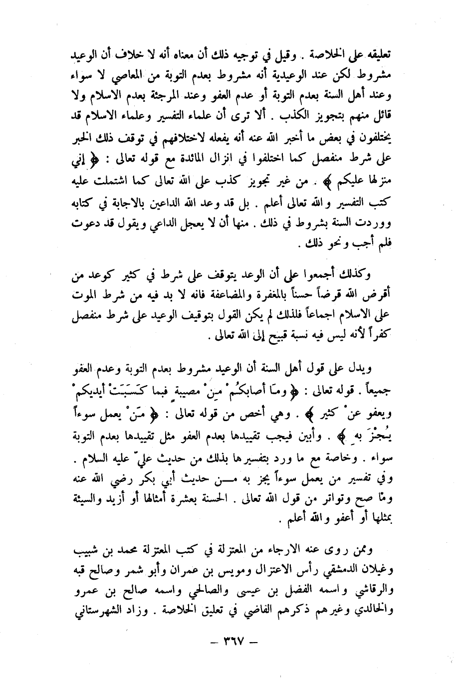تَعْلِيقه على الْخُلَاصَة وَقيل فِي تَوْجِيه ذَلِك أَن مَعْنَاهُ أَنه لَا خلاف أَن الْوَعيد مَشْرُوط لَكِن عِنْد الوعيدية أَنه مَشْرُوط بِعَدَمِ التَّوْبَة من الْمعاصِي لَا سَوَاء وَعند أهل السّنة بِعَدَمِ التَّوْبَة أَو عدم الْعَفو وَعند المرجئة بِعَدَمِ الاسلام وَلَا قَائِل مِنْهُم بتجويز الْكَذِب أَلا ترى أَن عُلَمَاء التَّفْسِير وعلماء الاسلام قد يَخْتَلِفُونَ فِي بعض مَا أخبر الله عَنهُ أَنه يَفْعَله لاختلافهم فِي توقف ذَلِك الْخَبَر على شَرط مُنْفَصِل كَمَا اخْتلفُوا فِي انزال الْمَائِدَة مَعَ قَوْله تَعَالَى {إِنِّي منزلهَا عَلَيْكُم} من غير تَجْوِيز كذب على الله تَعَالَى كَمَا اشْتَمَلت عَلَيْهِ كتب التَّفْسِير وَالله تَعَالَى أعلم بل قد وعد الله الداعين بالاجابة فِي كِتَابه ووردت السّنة بِشُرُوط فِي ذَلِك مِنْهَا أَن لَا يعجل الدَّاعِي وَيَقُول قد دَعَوْت فَلم أجب وَنَحْو ذَلِك