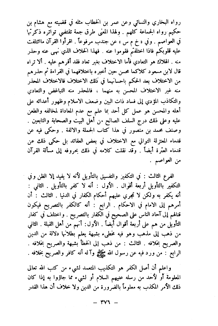 رَوَاهُ البُخَارِيّ وَالنَّسَائِيّ وَعَن عمر بن الْخطاب مثله فِي قَضيته مَعَ هِشَام بن حَكِيم رَوَاهُ الْجَمَاعَة كلهم وَلِهَذَا الْمَعْنى طرق جمة تَقْتَضِي تواتره ذكرتها فِي العواصم وَفِي خَ م س عَن جُنْدُب مَرْفُوعا اقرأوا الْقُرْآن مَا ائتلفت عَلَيْهِ قُلُوبكُمْ فاذا اختلفتم فَقومُوا عَنهُ فَهَذَا الْخلاف الَّذِي نهى عَنهُ وحذر مِنْهُ الْهَلَاك هُوَ التعادي فَأَما الِاخْتِلَاف بِغَيْر تُعَاد فقد أقرهم عَلَيْهِ أَلا ترَاهُ قَالَ لِابْنِ مَسْعُود كلاكما محسن حِين أخبرهُ باختلافهما فِي الْقِرَاءَة ثمَّ حذرهم من الِاخْتِلَاف بعد الحكم باحسانهما فِي ذَلِك الِاخْتِلَاف فالاختلاف المحذر مِنْهُ غير الِاخْتِلَاف المحسن بِهِ مِنْهُمَا فالمحذر مِنْهُ التباغض والتعادي والتكاذب الْمُؤَدِّي إِلَى فَسَاد ذَات الْبَين وَضعف الاسلام وَظُهُور أعدائه على أَهله والمحسن هُوَ عمل كل أحد بِمَا علم مَعَ عدم المعاداة لمُخَالفَة والطعن عَلَيْهِ وعَلى ذَلِك درج السّلف الصَّالح من أهل الْبَيْت وَالصَّحَابَة وَالتَّابِعِينَ وصنف مُحَمَّد بن مَنْصُور فِي هَذَا كتاب الحملة والالفة وَحكى فِيهِ عَن قدماء الْمُعْتَزلَة التوالي مَعَ الِاخْتِلَاف فِي بعض العقائد بل حكى ذَلِك عَن قدماء العترة أَيْضا وَقد نقلت كَلَامه فِي ذَلِك بِحُرُوفِهِ إِلَى مَسْأَلَة الْقُرْآن من العواصم