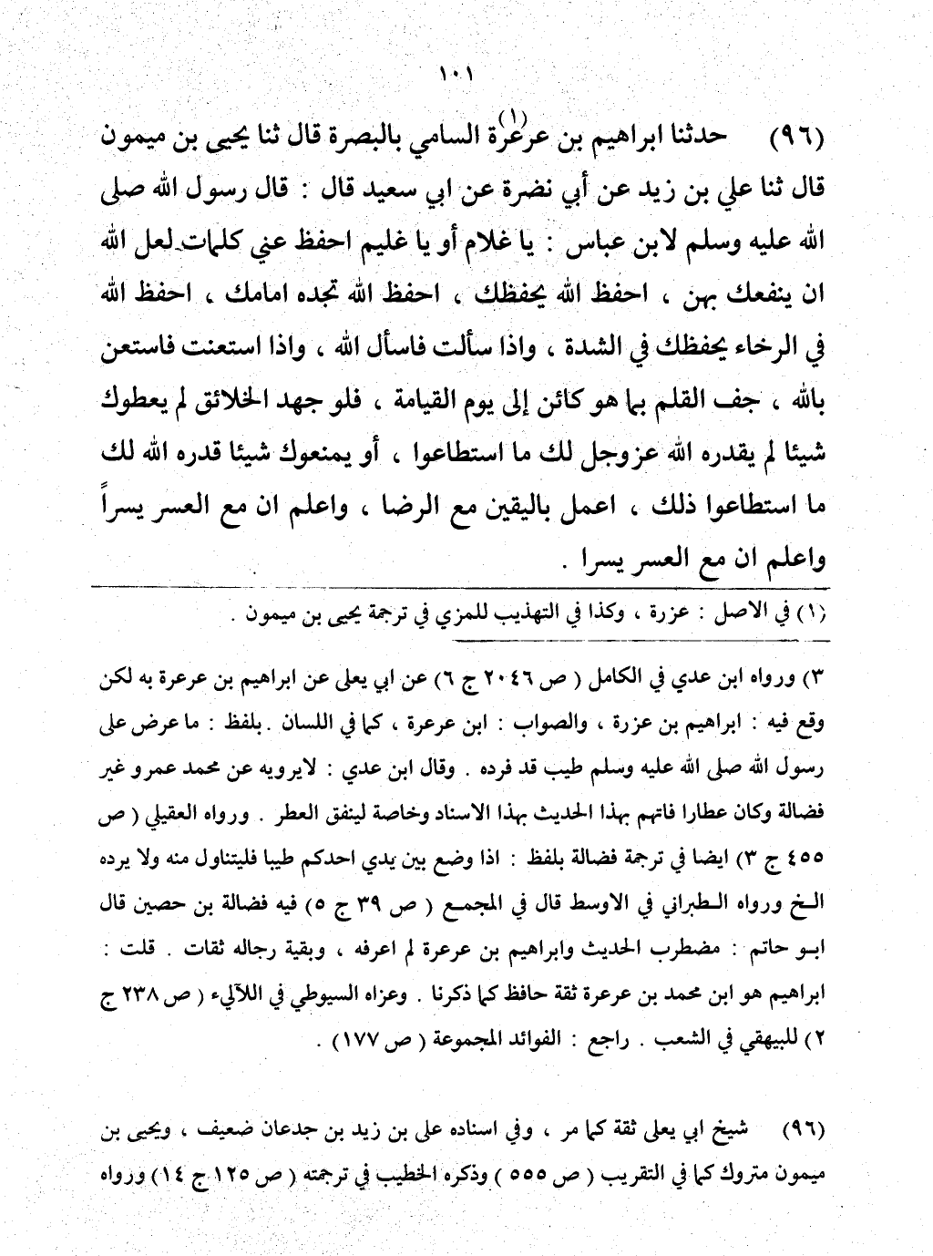 96 - حَدَّثَنَا إِبْرَاهِيمُ بْنُ عَزْرَةَ السَّامِيُّ بِالْبَصْرَةِ قَالَ: حَدَّثَنَا يَحْيَى بْنُ مَيْمُونٍ، قَالَ: حَدَّثَنَا عَلِيُّ بْنُ زَيْدٍ، عَنْ أَبِي نَضْرَةَ، عَنْ أَبِي سَعِيدٍ، قَالَ: قَالَ رَسُولُ اللَّهِ صَلَّى اللهُ عَلَيْهِ وَسَلَّمَ لِابْنِ عَبَّاسٍ: " يَا غُلَيْمُ، يَا غُلَامُ أَوْ يَا غُلَامُ، يَا غُلَيْمُ احْفَظْ عَنِّي كَلِمَاتٍ؛ لَعَلَّ اللَّهَ أَنْ يَنْفَعَكَ بِهِنَّ: §احْفَظِ اللَّهَ يَحْفَظْكَ، احْفَظِ اللَّهَ تَجِدْهُ أَمَامَكَ، احْفَظِ اللَّهَ فِي الرَّخَاءِ يَحْفَظْكَ فِي الشِّدَّةِ، إِذَا سَأَلْتَ فَاسْأَلِ اللَّهَ، وَإِذَا اسْتَعَنْتَ فَاسْتَعِنْ بِاللَّهِ، جَفَّ الْقَلَمُ بِمَا هُوَ كَائِنٌ إِلَى يَوْمِ الْقِيَامَةِ، فَلَوْ جَهِدَ الْخَلَائِقُ أَنْ يُعْطُوكَ شَيْئًا لَمْ يُقَدِّرْهُ اللَّهُ عَزَّ وَجَلَّ لَكَ مَا اسْتَطَاعُوا، أَوْ يَمْنَعُوكَ شَيْئًا قَدَّرَهُ اللَّهُ لَكَ مَا اسْتَطَاعُوا ذَلِكَ، اعْمَلْ بِالْيَقِينِ مَعَ الرِّضَى، وَاعْلَمْ أَنَّ مَعَ الْعُسْرِ يُسْرًا، وَاعْلَمْ أَنَّ مَعَ الْعُسْرِ يُسْرًا "
