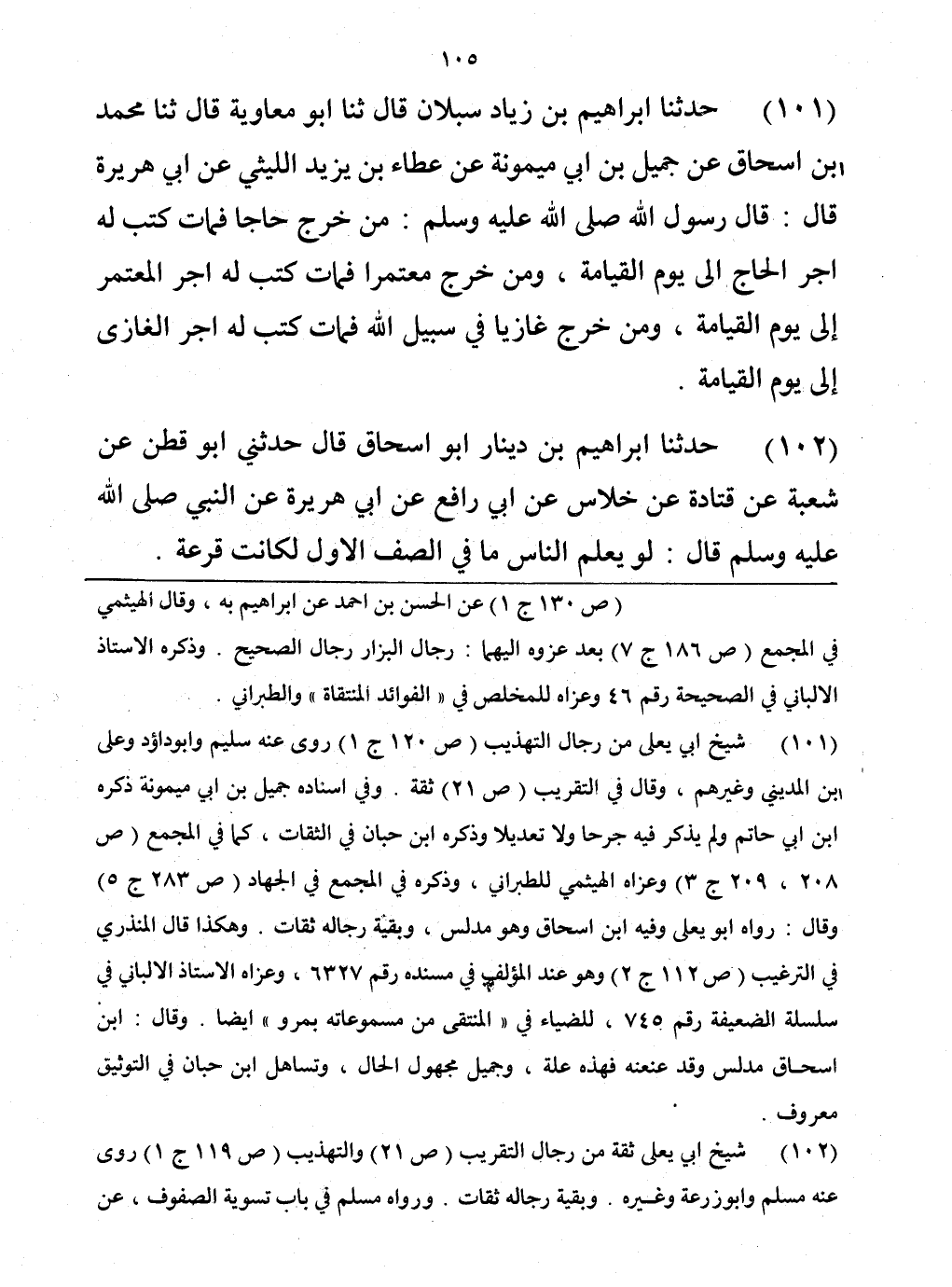 101 - حَدَّثَنَا إِبْرَاهِيمُ بْنُ زِيَادٍ سَبَلَانُ قَالَ: حَدَّثَنَا أَبُو مُعَاوِيَةَ، قَالَ: حَدَّثَنَا مُحَمَّدُ بْنُ إِسْحَاقَ، عَنْ جَمِيلِ بْنِ أَبِي مَيْمُونَةَ، عَنْ عَطَاءِ بْنِ يَزِيدَ اللَّيْثِيِّ، عَنْ أَبِي هُرَيْرَةَ، قَالَ: قَالَ رَسُولُ اللَّهِ صَلَّى اللهُ عَلَيْهِ وَسَلَّمَ: «§مَنْ خَرَجَ حَاجًّا، فَمَاتَ، كُتِبَ لَهُ أَجْرُ الْحَاجِّ إِلَى يَوْمِ الْقِيَامَةِ، وَمَنْ خَرَجَ مُعْتَمِرًا، فَمَاتَ، كُتِبَ لَهُ أَجْرُ الْمُعْتَمِرِ إِلَى يَوْمِ الْقِيَامَةِ، وَمَنْ خَرَجَ غَازِيًا فِي سَبِيلِ اللَّهِ، فَمَاتَ، كُتِبَ لَهُ أَجْرُ الْغَازِي إِلَى يَوْمِ الْقِيَامَةِ»
