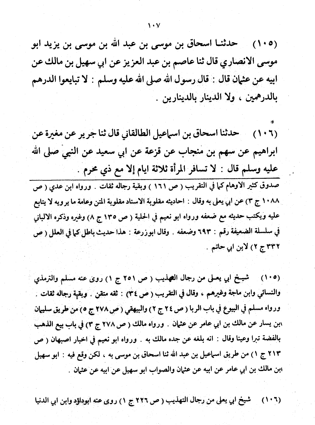 106 - حَدَّثَنَا إِسْحَاقُ بْنُ إِسْمَاعِيلَ الطَّالْقَانِيُّ، قَالَ: حَدَّثَنَا جَرِيرٌ، عَنْ مُغِيرَةَ، عَنْ إِبْرَاهِيمَ، عَنْ سَهْمِ بْنِ مِنْجَابٍ، عَنْ قَزَعَةَ، عَنْ أَبِي سَعِيدٍ، عَنِ النَّبِيِّ صَلَّى اللهُ عَلَيْهِ وَسَلَّمَ قَالَ: «§لَا تُسَافِرِ الْمَرْأَةُ ثَلَاثَةَ أَيَّامٍ إِلَّا مَعَ ذِي مَحْرَمٍ»