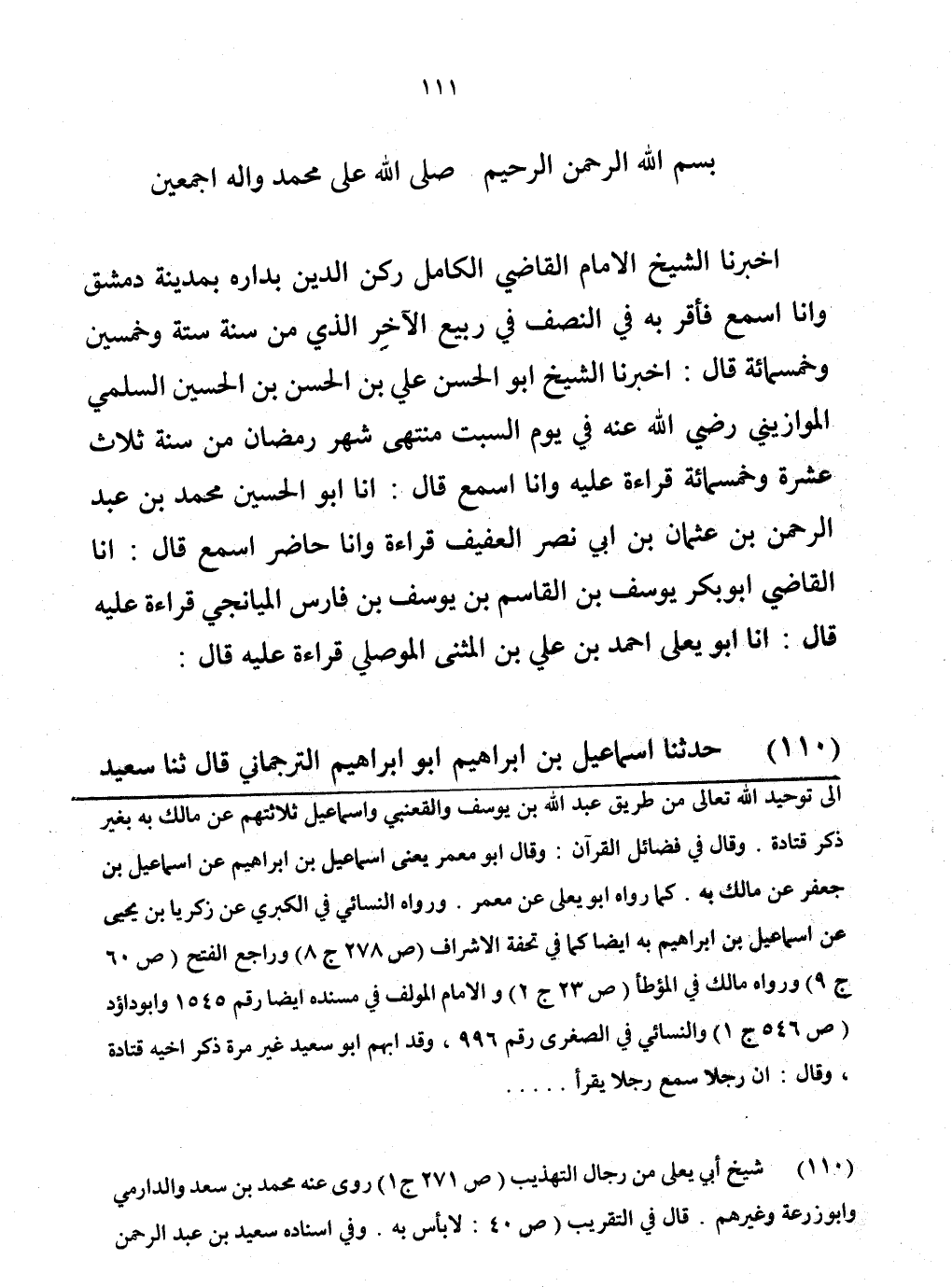 أَخْبَرَنَا الشَّيْخُ الْإِمَامُ الْقَاضِي الْكَامِلُ رُكْنُ الدِّينِ بِدَارِهِ بِمَدِينَةِ دِمَشْقَ وَأَنَا أَسْمَعُ فَأَقَرَّ بِهِ فِي النِّصْفِ مِنْ رَبِيعٍ الْآخَرِ الَّذِي مِنْ سَنَةِ سِتٍّ وَخَمْسِينَ وَخَمْسِمِائَةٍ قَالَ: أَخْبَرَنَا الشَّيْخُ أَبُو الْحَسَنِ عَلِيُّ بْنُ الْحَسَنِ بْنِ الْحُسَيْنِ السُّلَمِيُّ المْوَازِينِيُّ رَضِيَ اللَّهُ عَنْهُ فِي يَومِ السَّبْتِ مُسْتَهَلَّ شَهْرِ رَمَضَانَ مِنْ سَنَةِ ثَلَاثَ عَشْرَةَ وَخَمْسِمِائَةٍ قِرَاءَةً عَلَيْهِ، وَأَنَا أَسْمَعُ قَالَ: أَخْبَرَنَا أَبُو الْحُسَيْنِ مُحَمَّدُ بْنُ عَبْدِ الرَّحْمَنِ بْنِ عُثْمَانَ بْنِ أَبِي نَصْرٍ الْعَفِيفُ قِرَاءَةً وَأَنَا حَاضِرٌ أَسْمَعُ قَالَ: أَخْبَرَنَا الْقَاضِي أَبُو بَكْرٍ يُوسُفَ بْنُ الْقَاسِمِ بْنِ يُوسُفَ بْنِ فَارِسٍ الْمِيَانَجِيُّ قِرَاءَةً عَلَيْهِ قَالَ: أَخْبَرَنَا أَبُو يَعْلَى أَحْمَدُ بْنُ عَلِيُّ بْنُ الْمُثَنَّى الْمَوْصِلِيُّ قِرَاءَةً عَلَيْهِ قَالَ: