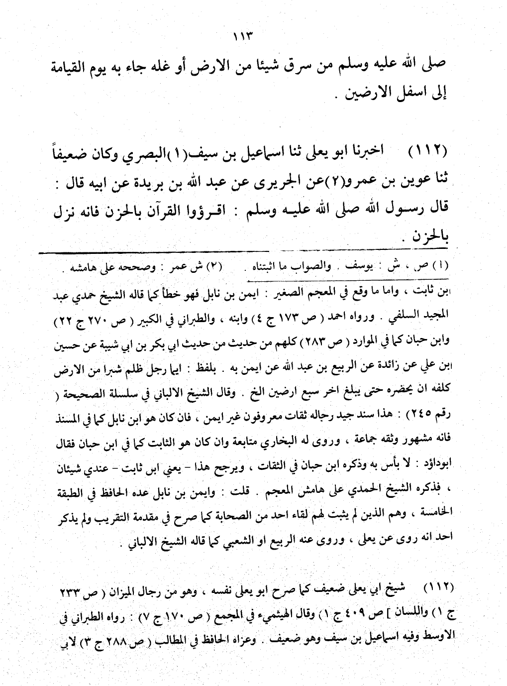 113 - حَدَّثَنَا إِسْمَاعِيلُ بْنُ سَيْفٍ الْبَصْرِيُّ، وَكَانَ ضَعِيفًا حَدَّثَنَا عُوَيْنُ بْنُ عَمْرٍو، عَنِ الْجُرَيْرِيِّ، عَنْ عَبْدِ اللَّهِ بْنِ بُرَيْدَةَ، عَنْ أَبِيهِ، قَالَ: قَالَ رَسُولُ اللَّهِ صَلَّى اللهُ عَلَيْهِ وَسَلَّمَ: «§اقْرَؤُوا الْقُرْآنَ بِالْحَزَنِ؛ فَإِنَّهُ نَزَلَ بِالْحَزَنِ»