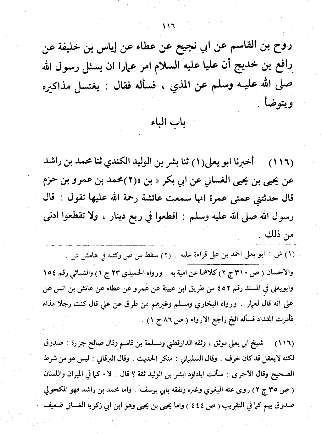 116 - حَدَّثَنَا بِشْرُ بْنُ الْوَلِيدِ الْكِنْدِيُّ، حَدَّثَنَا مُحَمَّدُ بْنُ رَاشِدٍ، عَنْ يَحْيَى بْنِ يَحْيَى الْغَسَّانِيِّ، عَنْ أَبِي بَكْرٍ مُحَمَّدِ بْنِ عَمْرِو بْنِ حَزْمٍ، قَالَ: حَدَّثَتْنِي عَمَّتِي عَمْرَةُ أَنَّهَا سَمِعَتْ عَائِشَةَ، رَحْمَةُ اللَّهِ عَلَيْهَا تَقُولُ: قَالَ رَسُولُ اللَّهِ صَلَّى اللهُ عَلَيْهِ وَسَلَّمَ: «§اقْطَعُوا فِي رُبْعِ دِينَارٍ، وَلَا تَقْطَعُوا فِيمَا أَدْنَى مِنْ ذَلِكَ»