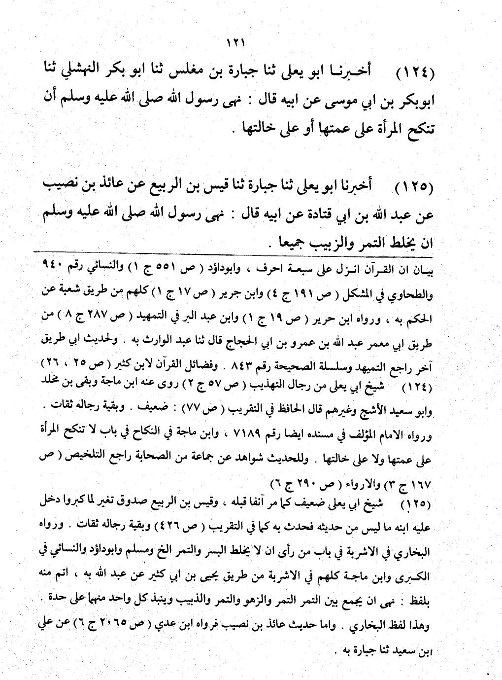 124 - حَدَّثَنَا جُبَارَةُ بْنُ مَغْلَسٍ، حَدَّثَنَا أَبُو بَكْرٍ النَّهْشَلِيُّ، حَدَّثَنَا أَبُو بَكْرِ بْنُ أَبِي مُوسَى، عَنْ أَبِيهِ، قَالَ: «§نَهَى رَسُولُ اللَّهِ صَلَّى اللهُ عَلَيْهِ وَسَلَّمَ أَنْ تُنْكَحَ الْمَرْأَةُ عَلَى عَمَّتِهَا، أَوْ عَلَى خَالَتِهَا»