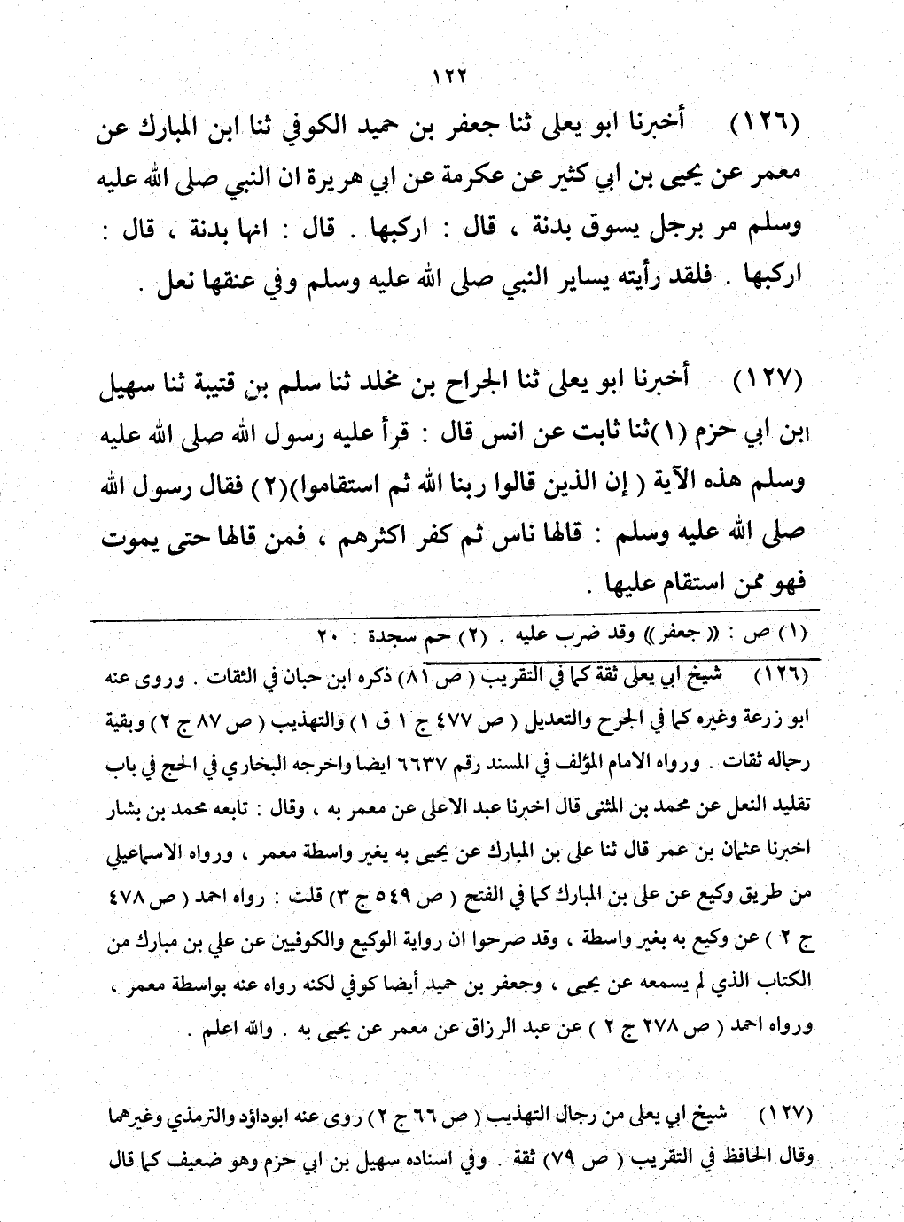 126 - حَدَّثَنَا جَعْفَرُ بْنُ حُمَيْدٍ الْكُوفِيُّ، حَدَّثَنَا ابْنُ الْمُبَارَكِ، عَنْ مَعْمَرٍ، عَنْ يَحْيَى بْنِ أَبِي كَثِيرٍ، عَنْ عِكْرِمَةَ، عَنْ أَبِي هُرَيْرَةَ، " أَنَّ النَّبِيَّ صَلَّى اللهُ عَلَيْهِ وَسَلَّمَ §مَرَّ بِرَجُلٍ يَسُوقُ بَدَنَةً قَالَ: «ارْكَبْهَا» . قَالَ: إِنَّهَا بَدَنَةٌ. قَالَ: «ارْكَبْهَا» . فَلَقَدْ رَأَيْتُهُ يُسَايِرُ النَّبِيَّ صَلَّى اللهُ عَلَيْهِ وَسَلَّمَ، وَفِي عُنُقِهَا نَعْلٌ "