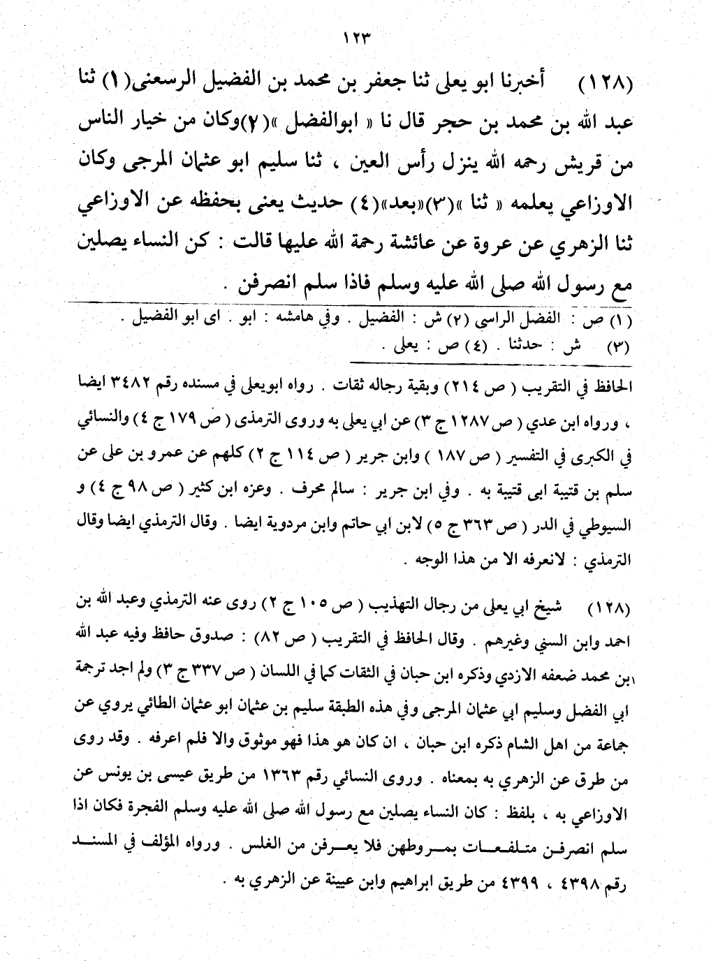 128 - حَدَّثَنَا جَعْفَرُ بْنُ مُحَمَّدِ بْنِ الْفُضَيْلِ الرَّاسِيُّ، حَدَّثَنَا عَبْدُ اللَّهِ بْنُ مُحَمَّدِ بْنِ حُجْرٍ، قَالَ أَبُو الْفَضْلِ: وَكَانَ مِنْ خِيَارِ النَّاسِ مِنْ قُرَيْشٍ رَحِمَهُ اللَّهُ، يَنْزِلُ رَأْسَ الْعَيْنِ حَدَّثَنَا سُلَيْمٌ أَبُو عُثْمَانَ الْمُرَجَّى وَكَانَ الْأَوْزَاعِيُّ يُعَلِّمُهُ حَدِيثَنَا بَعْدَ حَدِيثٍ. يَعْنِي يُحَفِّظُهُ عَنِ الْأَوْزَاعِيِّ، حَدَّثَنَا الزُّهْرِيُّ، عَنْ عُرْوَةَ، عَنْ عَائِشَةَ رَحْمَةُ اللَّهِ عَلَيْهَا قَالَتْ: «§كُنَّ النِّسَاءُ يُصَلِّينَ مَعَ رَسُولِ اللَّهِ صَلَّى اللهُ عَلَيْهِ وَسَلَّمَ، فَإِذَا سَلَّمَ انْصَرَفْنَ»