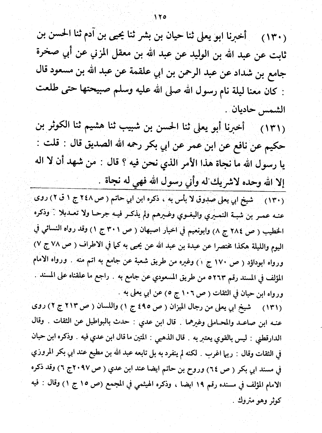 130 - حَدَّثَنَا حَيَّانُ بْنُ بِشْرٍ، حَدَّثَنَا يَحْيَى بْنُ آدَمَ، حَدَّثَنَا الْحَسَنُ بْنُ ثَابِتٍ، عَنْ عَبْدِ اللَّهِ بْنِ الْوَلِيدِ بْنِ عَبْدِ اللَّهِ بْنِ مَعْقَلٍ الْمُزَنِيِّ، عَنْ أَبِي صَخْرَةَ جَامِعِ بْنِ شَدَّادٍ، عَنْ عَبْدِ الرَّحْمَنِ بْنِ أَبِي عَلْقَمَةَ، عَنْ عَبْدِ اللَّهِ بْنِ مَسْعُودٍ، قَالَ: «§كَانَ مَعَنَا لَيْلَةَ نَامَ رَسُولُ اللَّهِ صَلَّى اللهُ عَلَيْهِ وَسَلَّمَ صَبِيحَتَهَا حَتَّى طَلَعَتِ الشَّمْسُ حَادِيَانِ»
