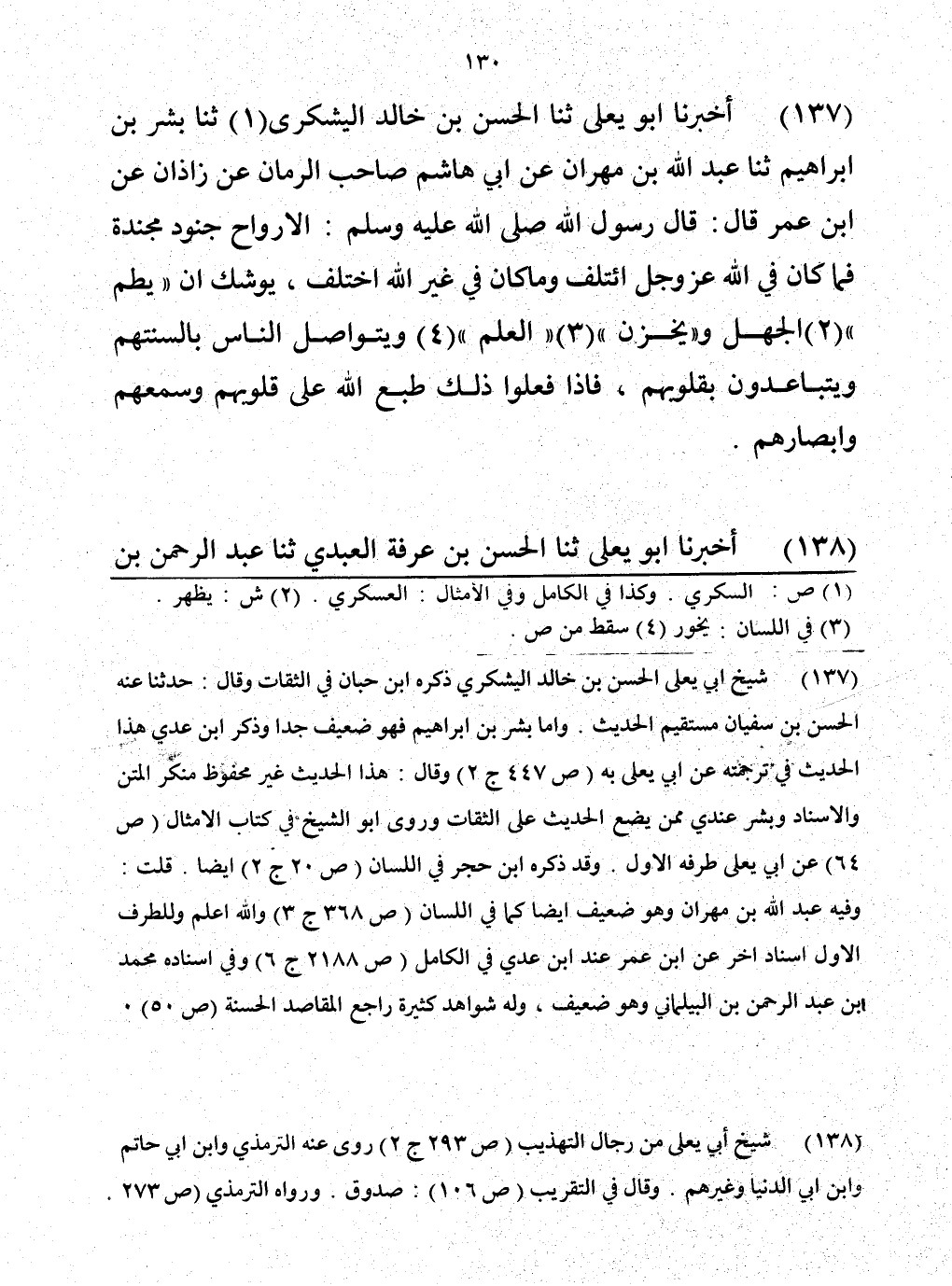 137 - حَدَّثَنَا الْحَسَنُ بْنُ خَالِدٍ السُّكَّرِيُّ، حَدَّثَنَا بِشْرُ بْنُ إِبْرَاهِيمَ، حَدَّثَنَا عَبْدُ اللَّهِ بْنُ مِهْرَانَ، عَنْ أَبِي هَاشِمٍ، صَاحِبِ الرُّمَّانِ، عَنْ زَاذَانَ، عَنِ ابْنِ عُمَرَ، قَالَ: قَالَ رَسُولُ اللَّهِ صَلَّى اللهُ عَلَيْهِ وَسَلَّمَ: «§الْأَرْوَاحُ جُنُودٌ مُجَنَّدَةٌ، فَمَا كَانَ فِي اللَّهِ عَزَّ وَجَلَّ ائْتَلَفَ، وَمَا كَانَ فِي غَيْرِ اللَّهِ اخْتَلَفَ. يُوشِكُ أَنْ يَطُمَّ الْجَهْلُ، وَيُخْزَنَ الْعِلْمُ، وَيَتَوَاصَلَ النَّاسُ بِأَلْسِنَتِهِمْ، وَيَتَبَاعَدُونَ بِقُلُوبِهِمْ، فَإِذَا فَعَلُوا ذَلِكَ طَبَعَ اللَّهُ عَلَى قُلُوبِهِمْ وَسَمْعِهِمْ وَأَبْصَارِهِمْ»
