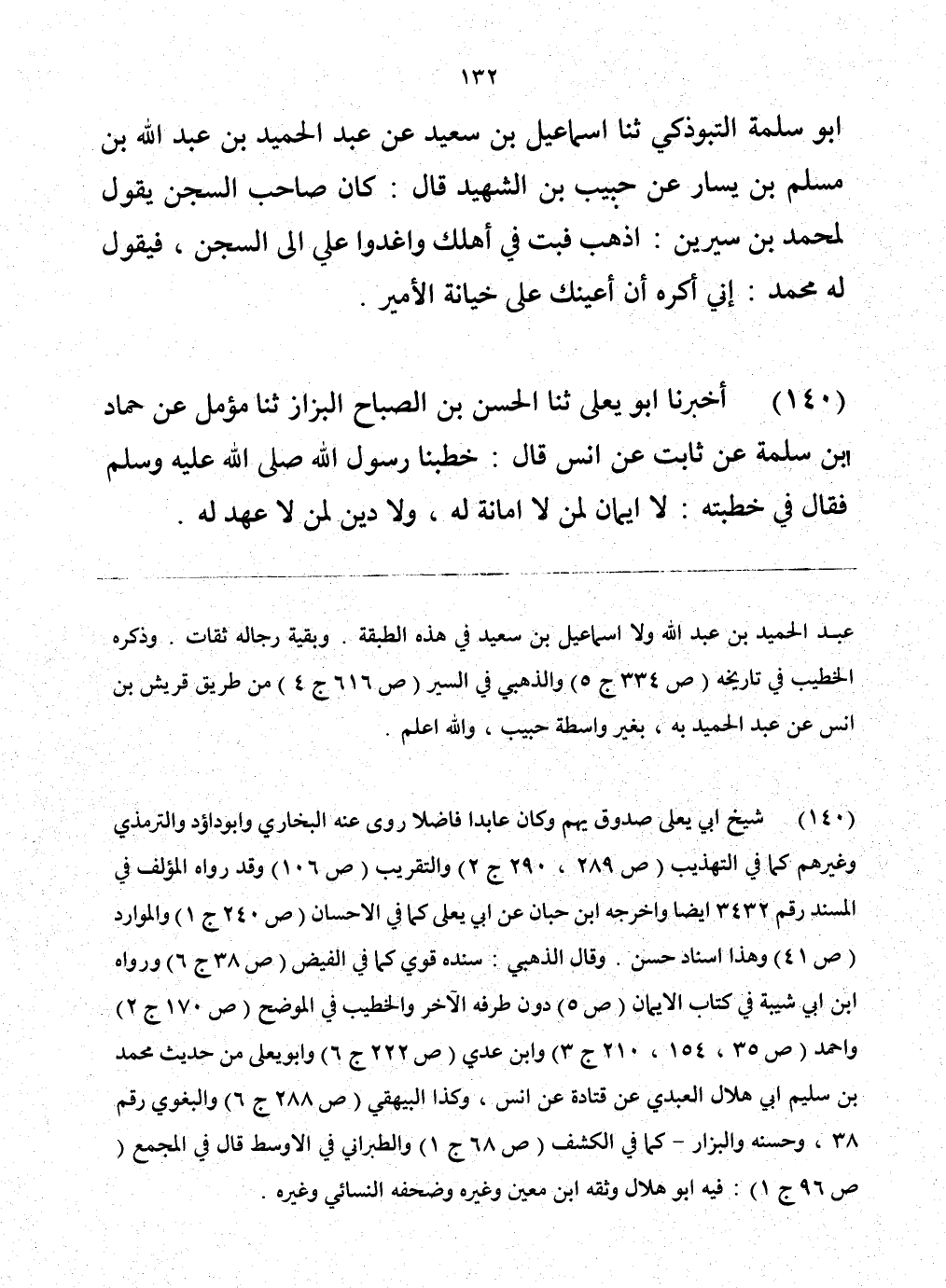 140 - حَدَّثَنَا الْحَسَنُ بْنُ الصَّبَّاحٍ الْبَزَّارُ، حَدَّثَنَا مُؤَمَّلٌ، عَنْ حَمَّادِ بْنِ سَلَمَةَ، عَنْ ثَابِتٍ، عَنْ أَنَسٍ، قَالَ: خَطَبَنَا رَسُولُ اللَّهِ صَلَّى اللهُ عَلَيْهِ وَسَلَّمَ، فَقَالَ فِي خُطْبَتِهِ: «§لَا إِيمَانَ لِمَنْ لَا أَمَانَةَ لَهُ، وَلَا دِينَ لِمَنْ لَا عَهْدَ لَهُ»