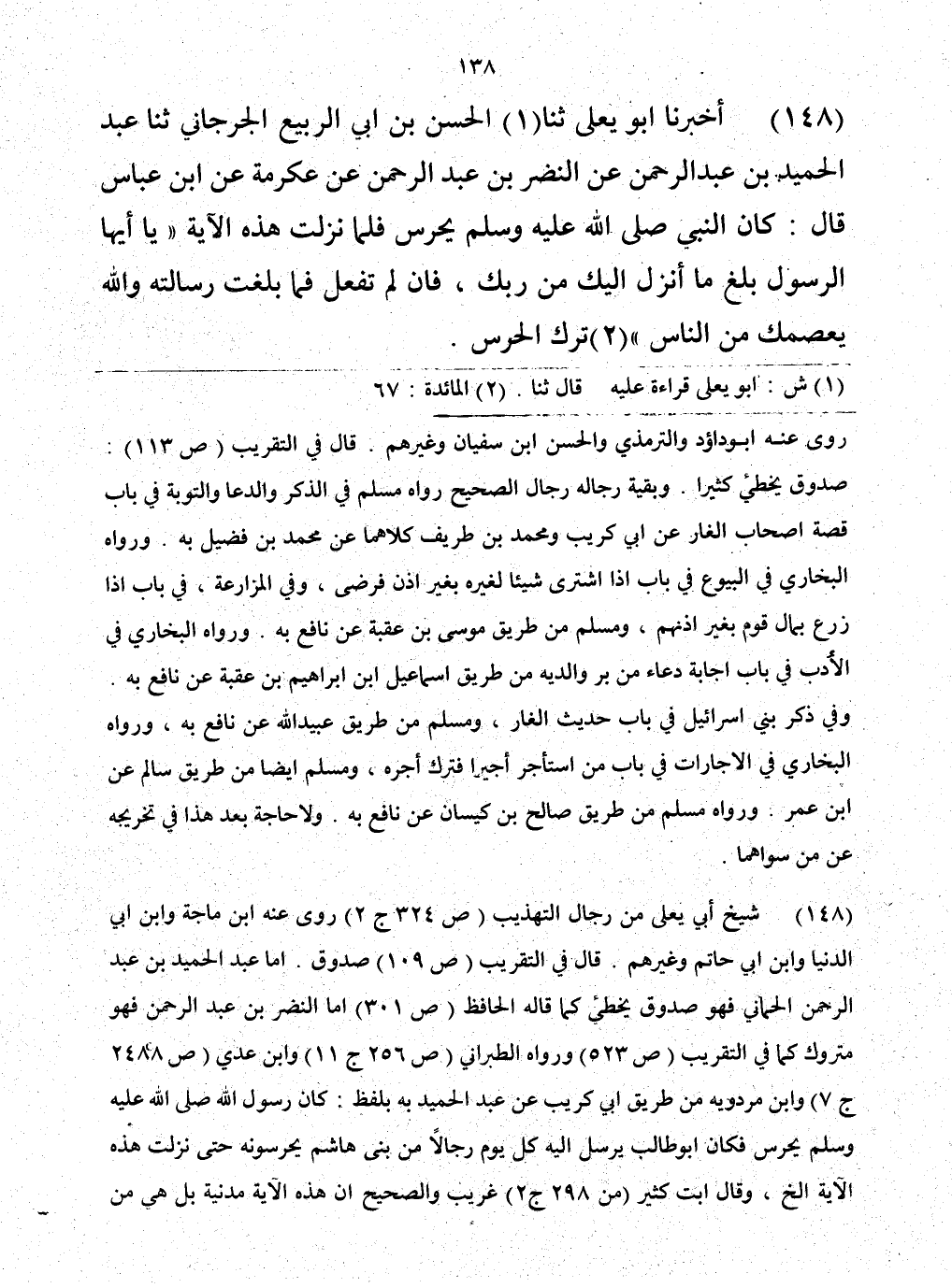 148 - حَدَّثَنَا الْحَسَنُ بْنُ أَبِي الرَّبِيعِ الْجُرْجَانِيُّ، حَدَّثَنَا عَبْدُ الْحَمِيدِ بْنُ عَبْدِ الرَّحْمَنِ، عَنِ النَّضْرِ بْنِ عَبْدِ الرَّحْمَنِ، عَنْ عِكْرِمَةَ، عَنِ ابْنِ عَبَّاسٍ، قَالَ: " كَانَ النَّبِيُّ صَلَّى اللهُ عَلَيْهِ وَسَلَّمَ يُحْرَسُ، فَلَمَّا نَزَلَتْ هَذِهِ الْآيَةُ: {§يَا أَيُّهَا الرَّسُولُ بَلِّغْ مَا أُنْزِلَ إِلَيْكَ مِنْ رَبِّكَ، وَإِنْ لَمْ تَفْعَلْ فَمَا بَلَّغْتَ رِسَالَتَهُ، وَاللَّهُ يَعْصِمُكَ مِنَ النَّاسِ} [المائدة: 67] تَرَكَ الْحَرَسَ "