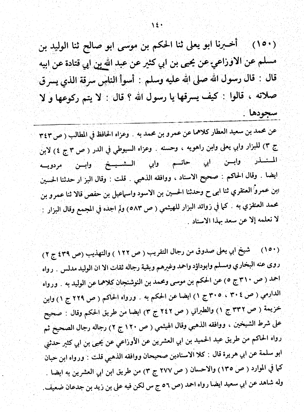 150 - حَدَّثَنَا الْحَكَمُ بْنُ مُوسَى أَبُو صَالِحٍ، حَدَّثَنَا الْوَلِيدُ بْنُ مُسْلِمٍ، عَنِ الْأَوْزَاعِيِّ، عَنْ يَحْيَى بْنِ أَبِي كَثِيرٍ، عَنْ عَبْدِ اللَّهِ بْنِ أَبِي قَتَادَةَ، عَنْ أَبِيهِ، قَالَ: قَالَ رَسُولُ اللَّهِ صَلَّى اللهُ عَلَيْهِ وَسَلَّمَ: «§أَسْوَأُ النَّاسِ سَرِقَةً الَّذِي يَسْرِقُ صَلَاتَهُ» . قَالُوا: كَيْفَ يَسْرِقُهَا يَا رَسُولَ اللَّهِ؟ قَالَ: «لَا يُتِمُّ رُكُوعَهَا، وَلَا سُجُودَهَا»