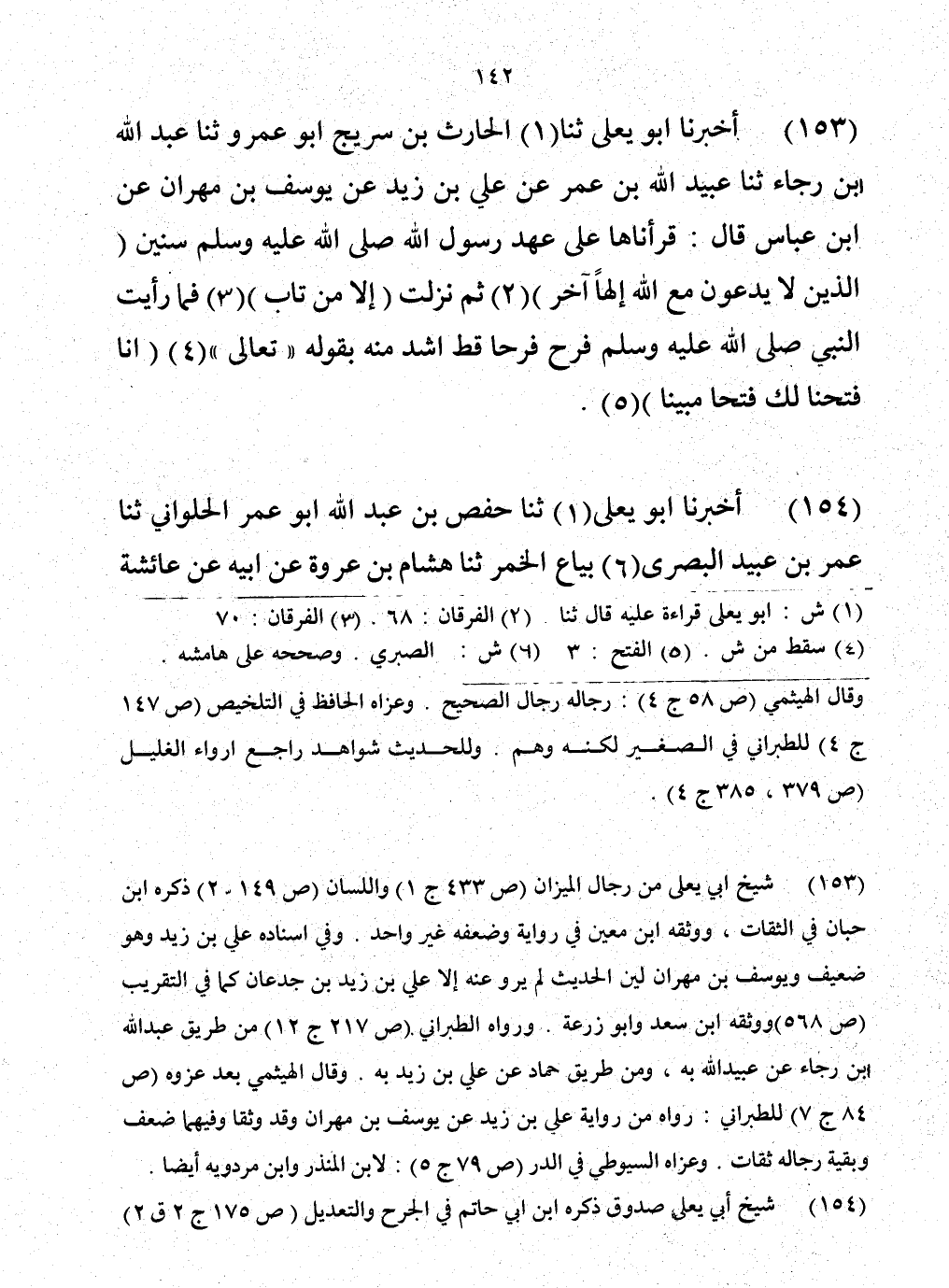 153 - حَدَّثَنَا الْحَارِثُ بْنُ سُرَيْجٍ أَبُو عَمْرٍو، حَدَّثَنَا عَبْدُ اللَّهِ بْنُ رَجَاءٍ، حَدَّثَنَا عُبَيْدُ اللَّهِ بْنُ عُمَرَ، عَنْ عَلِيِّ بْنِ زَيْدٍ، عَنْ يُوسُفَ بْنِ مِهْرَانَ، عَنِ ابْنِ عَبَّاسٍ، قَالَ: " قَرَأْنَاهَا عَلَى عَهْدِ رَسُولِ اللَّهِ صَلَّى اللهُ عَلَيْهِ وَسَلَّمَ سِنِينَ: {§الَّذِينَ لَا يَدْعُونَ مَعَ اللَّهِ إِلَهًا آخَرَ} [الفرقان: 68] ، ثُمَّ نَزَلَتْ: {إِلَّا مَنْ تَابَ} [مريم: 60] ، فَمَا رَأَيْتُ النَّبِيَّ صَلَّى اللهُ عَلَيْهِ وَسَلَّمَ فَرِحَ فَرَحًا قَطُّ أَشَدَّ مِنْهُ بِقَوْلِهِ تَعَالَى: {إِنَّا فَتَحْنَا لَكَ فَتْحًا مُبِينًا} [الفتح: 1] "