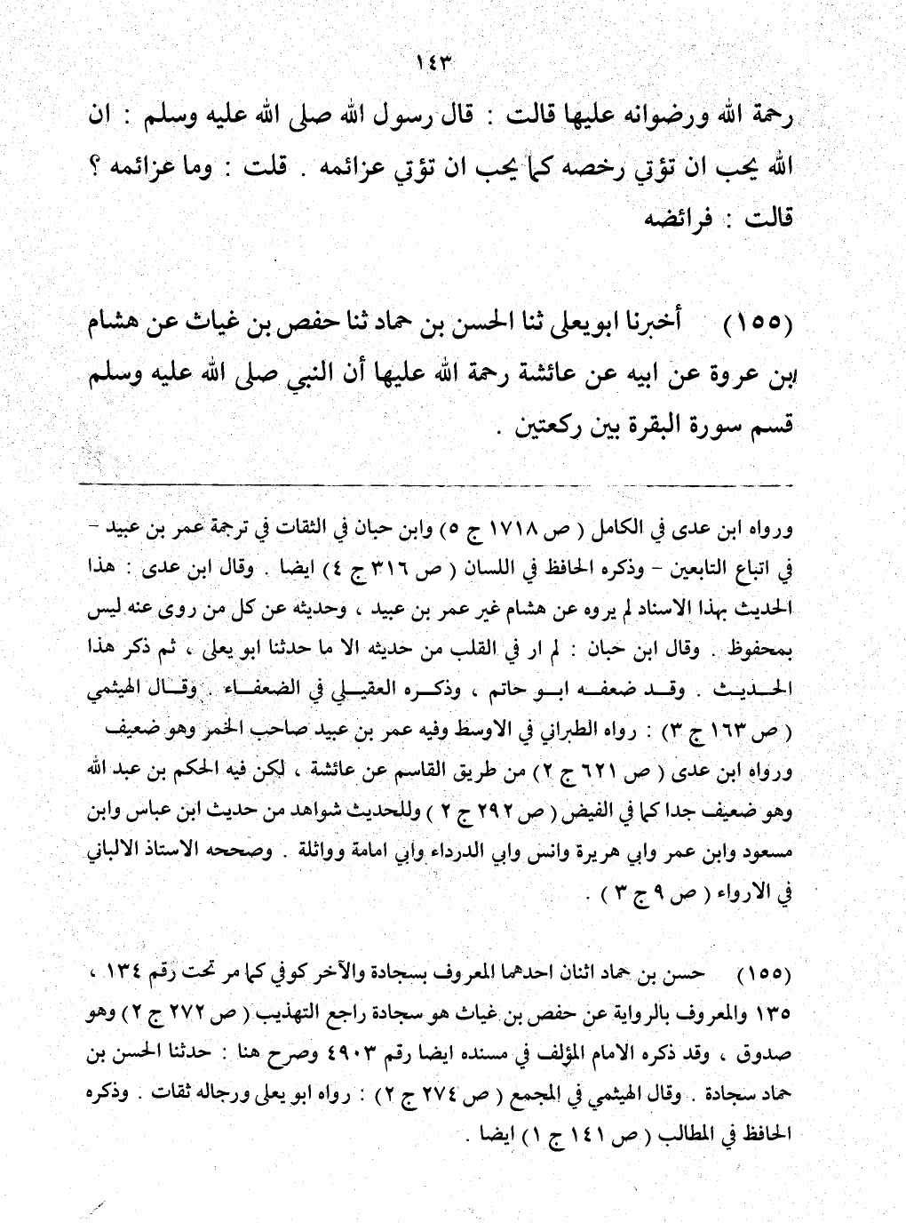 155 - حَدَّثَنَا الْحَسَنُ بْنُ حَمَّادٍ، حَدَّثَنَا حَفْصُ بْنُ غِيَاثٍ، عَنْ هِشَامِ بْنِ عُرْوَةَ، عَنْ أَبِيهِ، عَنْ عَائِشَةَ، رَحْمَةُ اللَّهِ عَلَيْهَا «أَنَّ النَّبِيَّ صَلَّى اللهُ عَلَيْهِ وَسَلَّمَ §قَسَمَ سُورَةَ الْبَقَرَةِ بَيْنَ رَكْعَتَيْنِ»