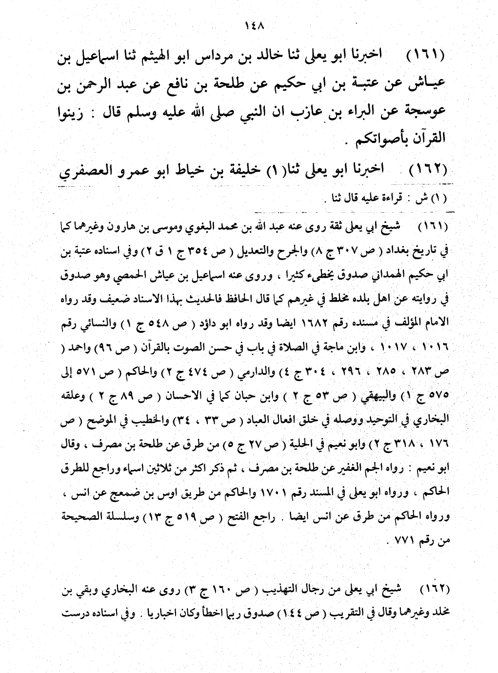 161 - حَدَّثَنَا خَالِدُ بْنُ مِرْدَاسٍ أَبُو الْهَيْثَمِ، حَدَّثَنَا إِسْمَاعِيلُ بْنُ عَيَّاشٍ، عَنْ عُتْبَةَ بْنِ أَبِي حَكِيمٍ، عَنْ طَلْحَةَ بْنِ نَافِعٍ، عَنْ عَبْدِ الرَّحْمَنِ بْنِ عَوْسَجَةَ، عَنِ الْبَرَاءِ بْنِ عَازِبٍ، أَنَّ النَّبِيَّ صَلَّى اللهُ عَلَيْهِ وَسَلَّمَ قَالَ: «§زَيِّنُوا الْقُرْآنَ بِأَصْوَاتِكُمْ»