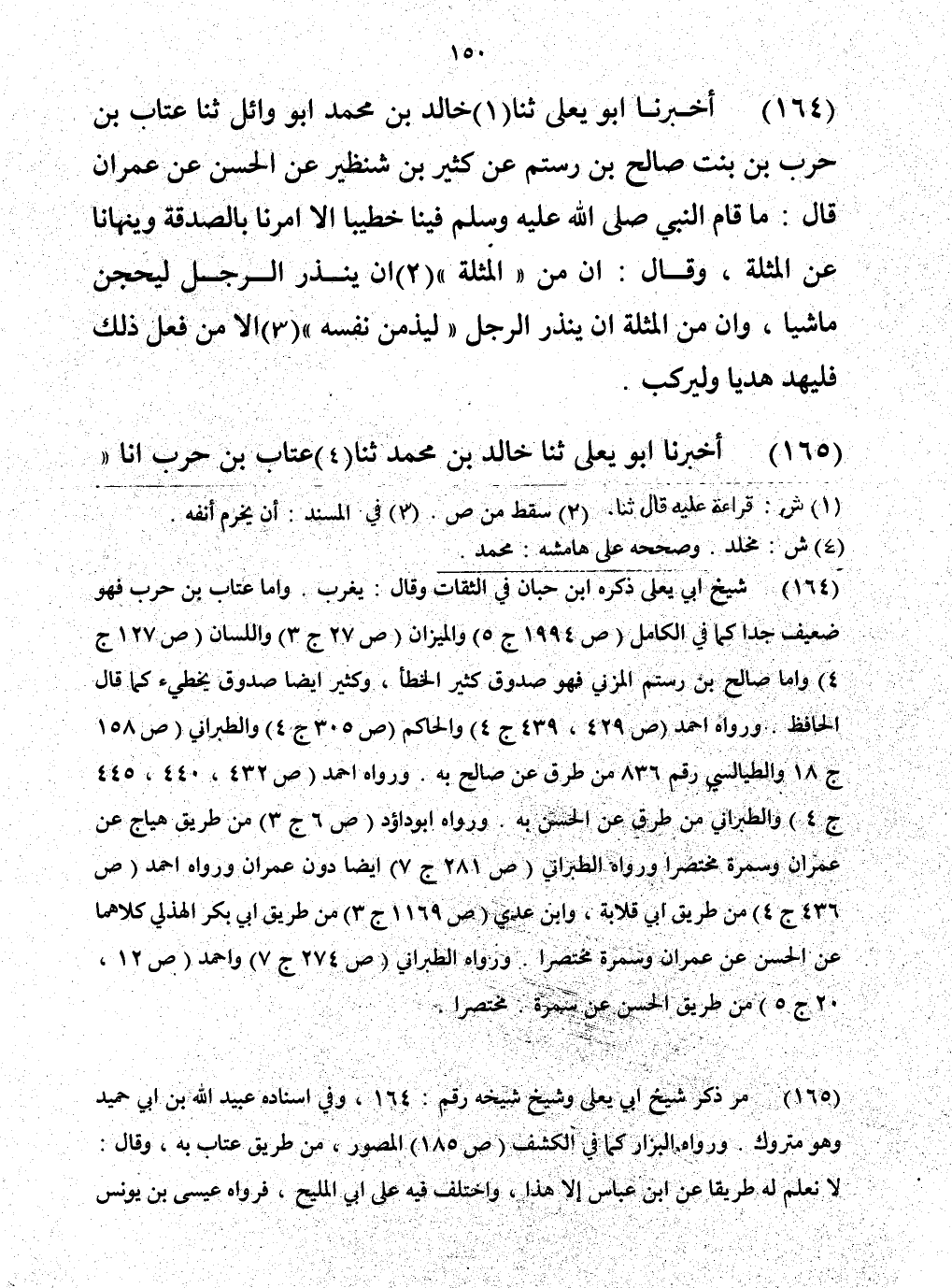 164 - حَدَّثَنَا خَالِدُ بْنُ مُحَمَّدٍ أَبُو وَائِلٍ، حَدَّثَنَا عَتَّابُ بْنُ حَرْبٍ ابْنُ بِنْتِ صَالِحِ بْنِ رُسْتُمَ، أَخْبَرَنَا صَالِحُ بْنُ رُسْتُمَ، عَنْ كَثِيرِ بْنِ شِنْظِيرٍ، عَنِ الْحَسَنِ، عَنْ عِمْرَانَ، قَالَ: " مَا قَامَ النَّبِيُّ صَلَّى اللهُ عَلَيْهِ وَسَلَّمَ فِينَا خَطِيبًا إِلَّا أَمَرَنَا بِالصَّدَقَةِ، وَنَهَانَا عَنِ الْمُثْلَةِ، وَقَالَ: «إِنَّ §مِنَ الْمُثْلَةِ أَنْ يَنْذِرَ الرَّجُلُ لَيَحُجَّنَّ مَاشِيًا، وإِنَّ مِنَ الْمُثْلَةِ أَنْ يَنْذِرَ الرَّجُلُ لَيَزُمَّنَّ نَفْسَهُ، أَلَا فَمَنْ فَعَلَ ذَاكَ، فَلْيُهْدِ هَدْيًا، وَلْيَرْكَبْ»