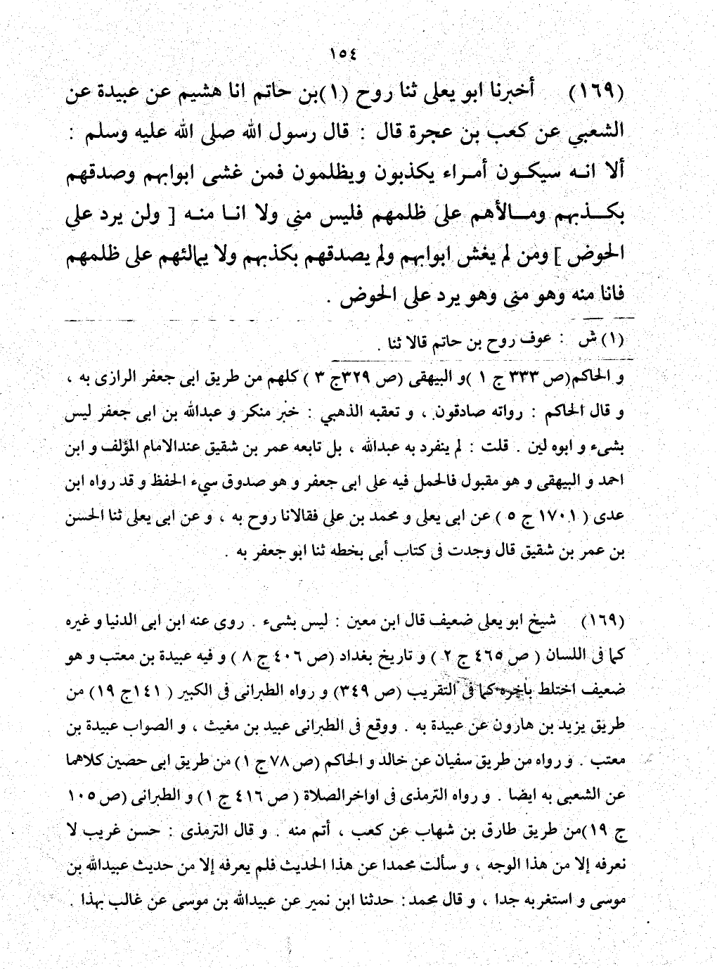 169 - حَدَّثَنَا رَوْحُ بْنُ حَاتِمٍ، أَخْبَرَنَا هُشَيْمٌ، عَنْ عُبَيْدَةَ، عَنِ الشَّعْبِيِّ، عَنْ كَعْبِ بْنِ عُجْرَةَ، قَالَ: قَالَ رَسُولُ اللَّهِ صَلَّى اللهُ عَلَيْهِ وَسَلَّمَ: «أَلَا إِنَّهُ §سَيَكُونُ أُمَرَاءُ يَكْذِبُونَ وَيَظْلِمُونَ، فَمَنْ غَشِيَ أَبْوَابَهُمْ، وَصَدَّقَهُمْ بِكَذِبِهِمْ، وَمَالَأَهُمْ عَلَى ظُلْمِهِمْ، فَلَيْسَ مِنِّي، وَلَا أَنَا مِنْهُ، وَمَنْ لَمْ يَغْشَ أَبْوَابَهُمْ، وَلَمْ يُصَدِّقْهُمْ بِكَذِبِهِمْ، وَلَمْ يُمَالِئْهُمْ عَلَى ظُلْمِهِمْ، فَأَنَا مِنْهُ، وَهُوَ مِنِّي، وَهُوَ يَرِدُ عَلَيَّ الْحَوْضَ»