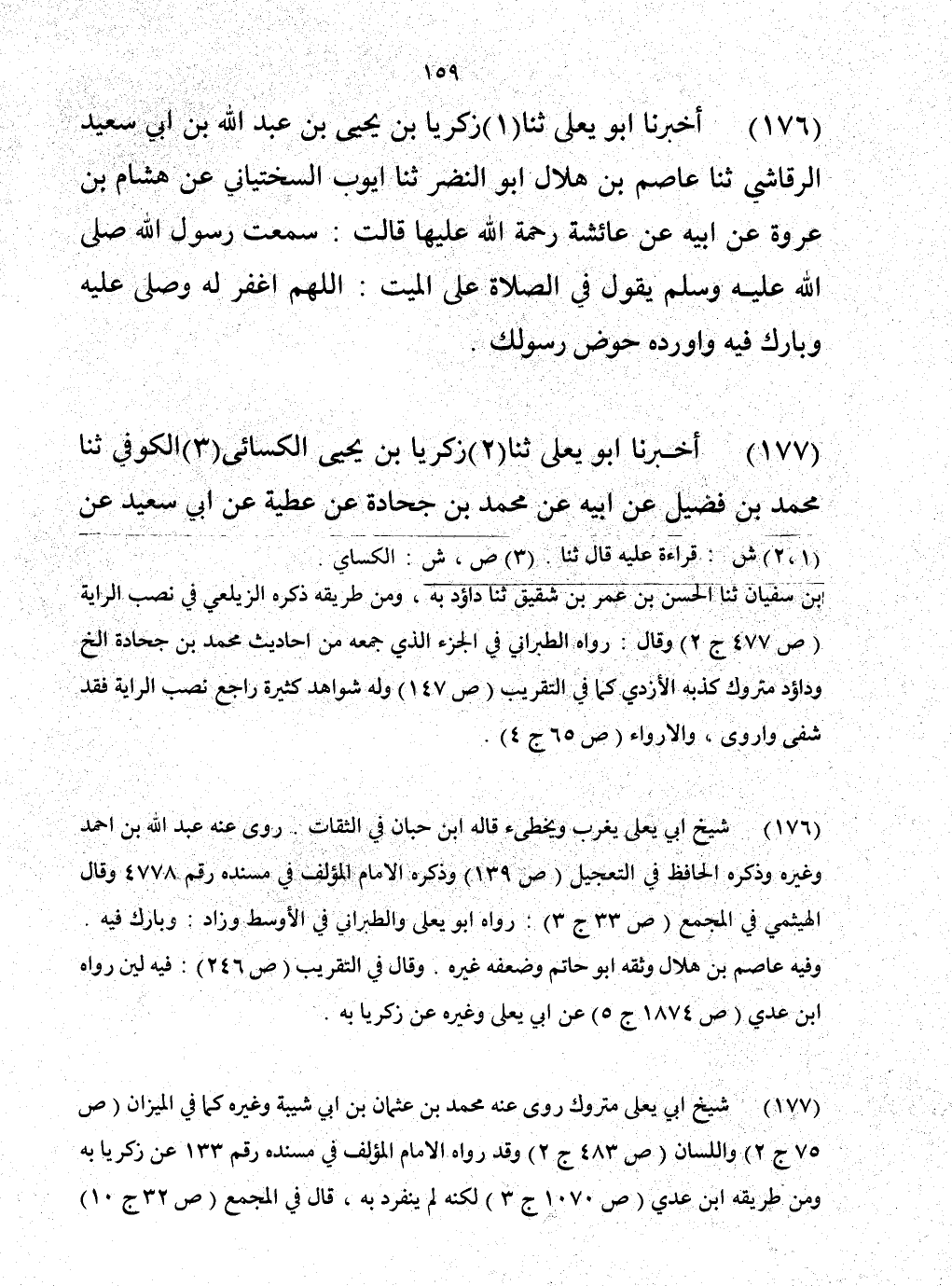 176 - حَدَّثَنَا زَكَرِيَّا بْنُ يَحْيَى بْنِ عَبْدِ اللَّهِ بْنِ أَبِي سَعِيدٍ الرَّقَاشِيُّ، حَدَّثَنَا عَاصِمُ بْنُ هِلَالٍ أَبُو النَّضْرِ، حَدَّثَنَا أَيُّوبُ السِّخْتِيَانِيُّ، عَنْ هِشَامِ بْنِ عُرْوَةَ، عَنْ أَبِيهِ، عَنْ عَائِشَةَ، رَحْمَةُ اللَّهِ عَلَيْهَا قَالَتْ: سَمِعْتُ رَسُولَ اللَّهِ صَلَّى اللهُ عَلَيْهِ وَسَلَّمَ يَقُولُ فِي الصَّلَاةِ عَلَى الْمَيِّتِ: «§اللَّهُمَّ اغْفِرْ لَهُ، وَصَلِّ عَلَيْهِ، وَبَارِكْ فِيهِ، وَأَوْرِدْهُ حَوْضَ رَسُولِكَ»