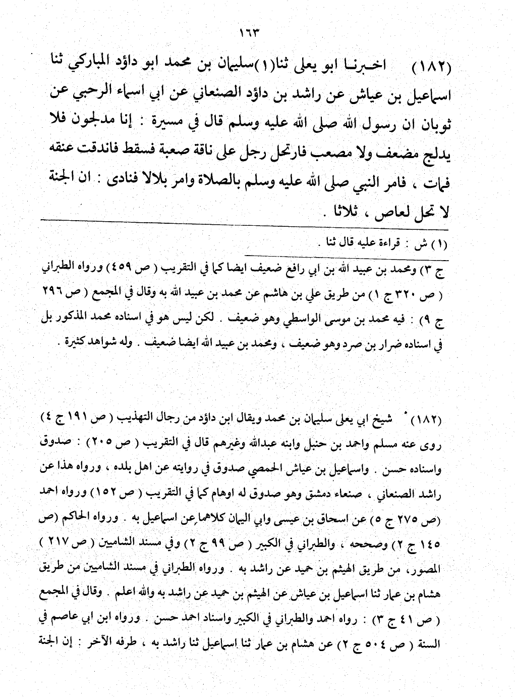 182 - حَدَّثَنَا سُلَيْمَانُ بْنُ مُحَمَّدٍ أَبُو دَاوُدَ الْمُبَارَكِيُّ، حَدَّثَنَا إِسْمَاعِيلُ بْنُ عَيَّاشٍ، عَنْ رَاشِدِ بْنِ دَاوُدَ الصَّنْعَانِيِّ، عَنْ أَبِي أَسْمَاءَ الرَّحَبِيِّ، عَنْ ثَوْبَانَ، " أَنَّ رَسُولَ اللَّهِ صَلَّى اللهُ عَلَيْهِ وَسَلَّمَ قَالَ فِي مَسِيرٍ لَهُ: «إِنَّا مُدْلِجُونَ، فَلَا يُدْلِجْ مُضْعِفٌ، وَلَا مُصْعِبٌ» . فَارْتَحَلَ رَجُلٌ عَلَى نَاقَةٍ صَعْبَةٍ، فَسَقَطَ، فَانْدَقَّتْ عُنُقُهُ، فَمَاتَ، فَأَمَرَ النَّبِيُّ صَلَّى اللهُ عَلَيْهِ وَسَلَّمَ بِالصَّلَاةِ عَلَيْهِ، وَأَمَرَ بِلَالًا، فَنَادَى: «§إِنَّ الْجَنَّةَ لَا تَحِلُّ لِعَاصٍ» ثَلَاثًا