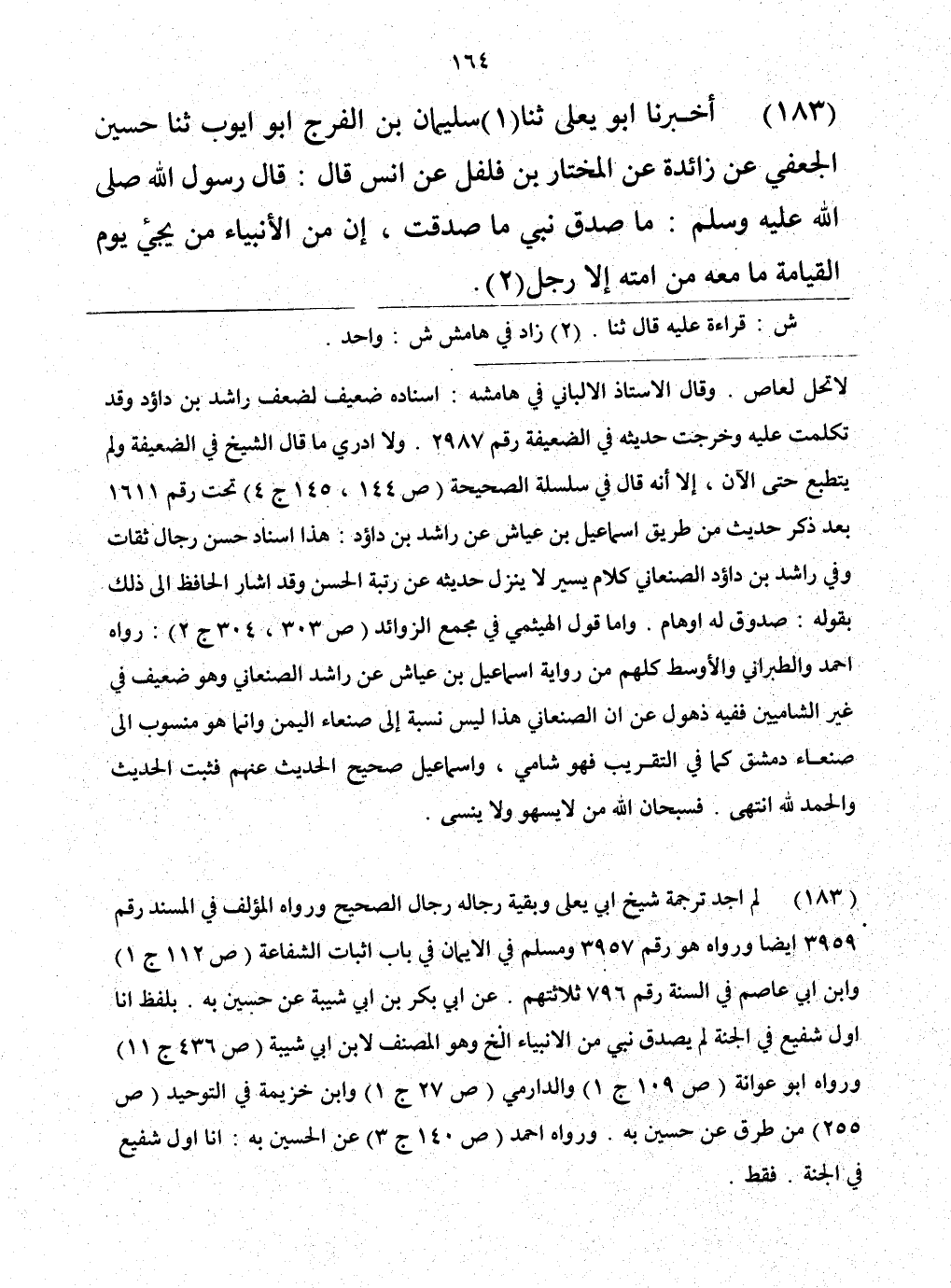 183 - حَدَّثَنَا سُلَيْمَانُ بْنُ الْفَرَجِ أَبُو أَيُّوبَ، حَدَّثَنَا حُسَيْنٌ الْجُعْفِيُّ، عَنْ زَائِدَةَ، عَنِ الْمُخْتَارِ بْنِ فُلْفُلٍ، عَنْ أَنَسٍ، قَالَ: قَالَ رَسُولُ اللَّهِ صَلَّى اللهُ عَلَيْهِ وَسَلَّمَ: «§مَا صُدِّقَ نَبِيٌّ مَا صُدِّقْتُ، إِنَّ مِنَ الْأَنْبِيَاءِ مَنْ يَجِيءُ يَوْمَ الْقِيَامَةِ، مَا مَعَهُ مِنْ أُمَّتِهِ إِلَّا رَجُلٌ»