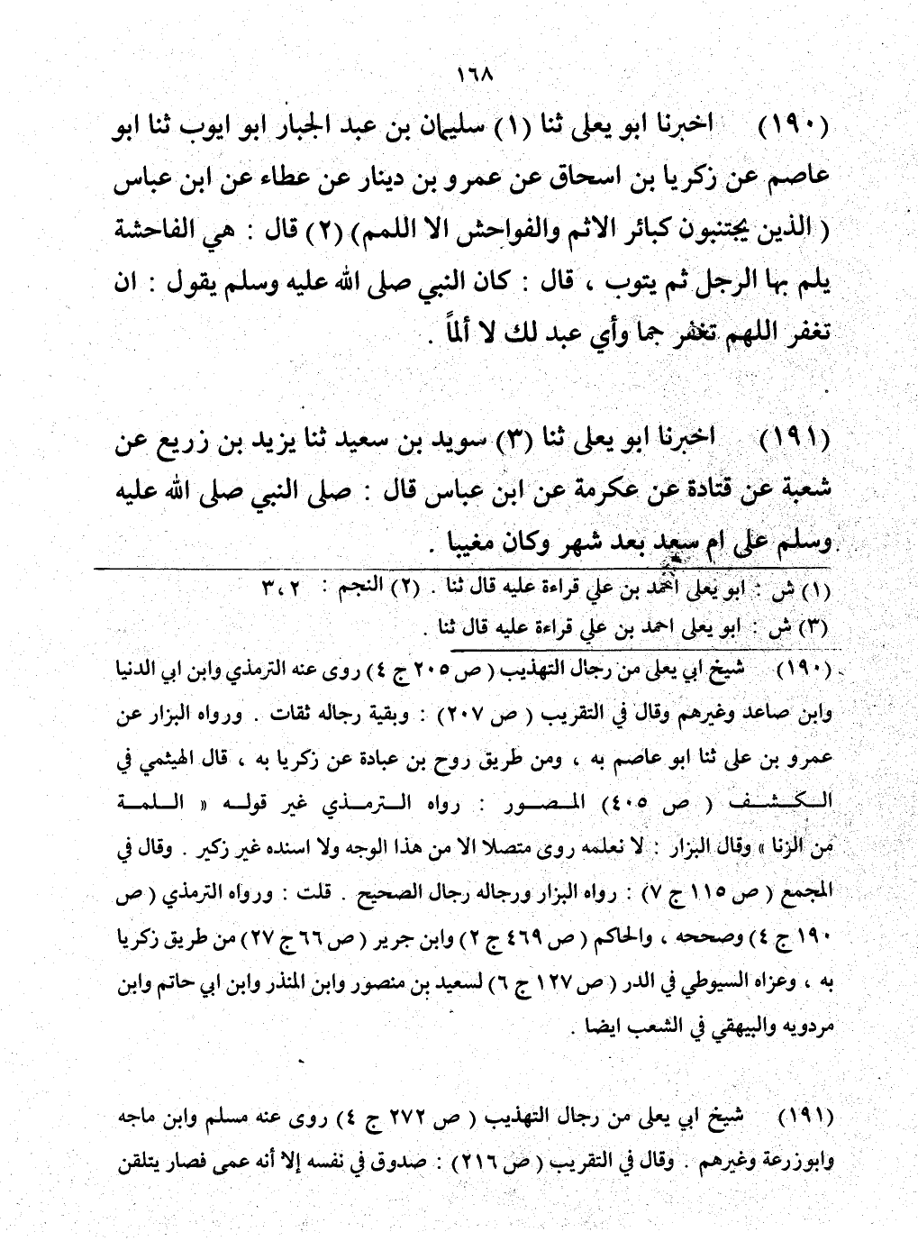 190 - حَدَّثَنَا سُلَيْمَانُ بْنُ عَبْدِ الْجَبَّارِ أَبُو أَيُّوبَ، حَدَّثَنَا أَبُو عَاصِمٍ، عَنْ زَكَرِيَّا بْنِ إِسْحَاقَ، عَنْ عَمْرِو بْنِ دِينَارٍ، عَنْ عَطَاءٍ، عَنِ ابْنِ عَبَّاسٍ: {الَّذِينَ يَجْتَنِبُونَ كَبَائِرَ الْإِثْمِ وَالْفَوَاحِشَ إِلَّا اللَّمَمَ} [سورة: النجم، آية رقم: 32] قَالَ: «هِيَ الْفَاحِشَةُ يُلِمُّ بِهَا الرَّجُلُ، ثُمَّ يَتُوبُ» قَالَ: كَانَ النَّبِيُّ صَلَّى اللهُ عَلَيْهِ وَسَلَّمَ يَقُولُ: «§إِنْ تَغْفِرِ اللَّهُمَّ تَغْفِرْ جَمَّا وَأَيُّ عَبْدٍ لَكَ لَا أَلَمَّا»