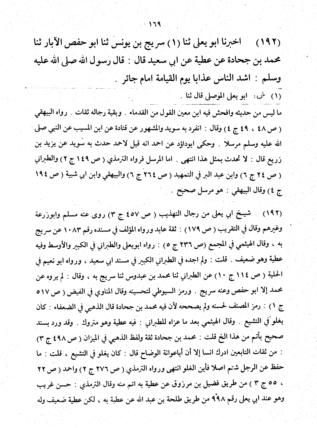192 - حَدَّثَنَا سُرَيْجُ بْنُ يُونُسَ، حَدَّثَنَا أَبُو حَفْصٍ الْأَبَّارُ، حَدَّثَنَا مُحَمَّدُ بْنُ جُحَادَةَ، عَنْ عَطِيَّةَ، عَنْ أَبِي سَعِيدٍ، قَالَ: قَالَ رَسُولُ اللَّهِ صَلَّى اللهُ عَلَيْهِ وَسَلَّمَ: «§أَشَدُّ النَّاسِ عَذَابًا يَوْمَ الْقِيَامَةِ إِمَامٌ جَائِرٌ»