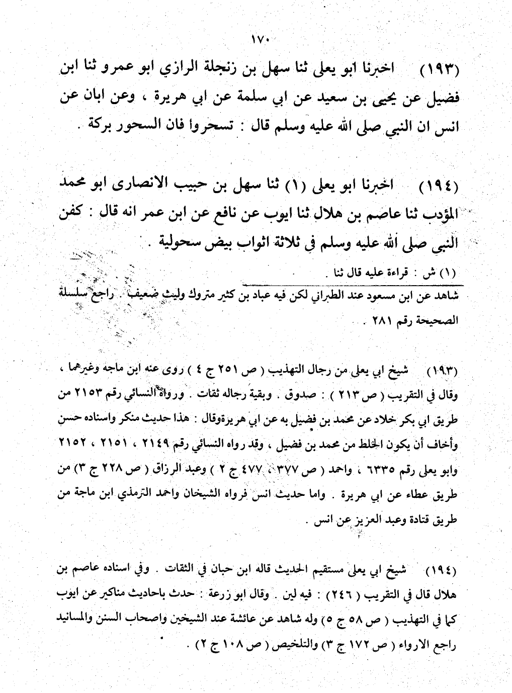 193 - حَدَّثَنَا سَهْلُ بْنُ زَنْجَلَةَ الرَّازِيُّ أَبُو عَمْرٍو، حَدَّثَنَا ابْنُ فُضَيْلٍ، عَنْ يَحْيَى بْنِ سَعِيدٍ، عَنْ أَبِي سَلَمَةَ، عَنْ أَبِي هُرَيْرَةَ، وَعَنْ أَبَانَ، عَنْ أَنَسٍ، أَنَّ النَّبِيَّ صَلَّى اللهُ عَلَيْهِ وَسَلَّمَ قَالَ: «§تَسَحَّرُوا؛ فَإِنَّ فِي السَّحُورِ بَرَكَةً»