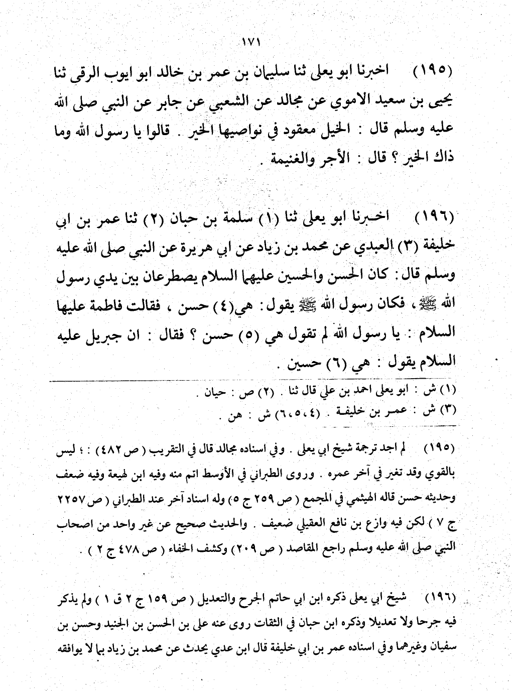 195 - حَدَّثَنَا سُلَيْمَانُ بْنُ عُمَرَ بْنِ خَالِدٍ أَبُو أَيُّوبَ الرَّقِّيُّ، حَدَّثَنَا يَحْيَى بْنُ سَعِيدٍ الْأُمَوِيُّ، عَنْ مُجَالِدٍ، عَنِ الشَّعْبِيِّ، عَنْ جَابِرٍ، عَنِ النَّبِيِّ صَلَّى اللهُ عَلَيْهِ وَسَلَّمَ قَالَ: «§الْخَيْلُ مَعْقُودٌ فِي نَوَاصِيهَا الْخَيْرُ» ، قَالُوا: يَا رَسُولَ اللَّهِ، وَمَا ذَاكَ الْخَيْرُ؟ قَالَ: «الْأَجْرُ وَالْغَنِيمَةُ»