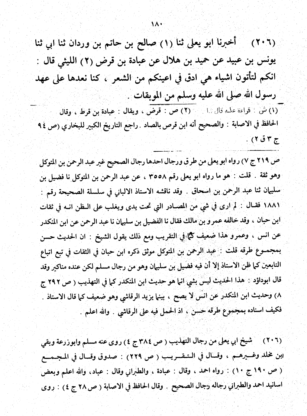 206 - حَدَّثَنَا صَالِحُ بْنُ حَاتِمِ بْنِ وَرْدَانَ، حَدَّثَنَا أَبِي، حَدَّثَنَا يُونُسُ بْنُ عُبَيْدٍ، عَنْ حُمَيْدِ بْنِ هِلَالٍ، عَنْ عُبَادَةَ بْنِ قُرْصٍ اللَّيْثِيِّ، قَالَ: «§إِنَّكُمْ لَتَأْتُونَ أَشْيَاءَ هِيَ أَدَقُّ فِي أَعْيُنِكُمْ مِنَ الشَّعْرِ، كُنَّا نَعُدُّهَا عَلَى عَهْدِ رَسُولِ اللَّهِ صَلَّى اللهُ عَلَيْهِ وَسَلَّمَ مِنَ الْمُوبِقَاتِ»