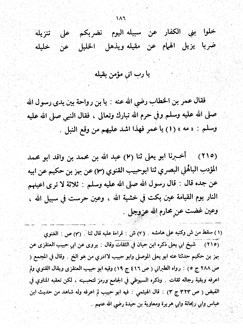 215 - حَدَّثَنَا عَبْدُ اللَّهِ بْنُ مُحَمَّدِ بْنِ وَاقِدٍ أَبُو مُحَمَّدٍ الْمُؤَدِّبُ الْبَاهِلِيُّ الْبَصْرِيُّ، حَدَّثَنَا أَبُو حَبِيبٍ الْقَنَوِيُّ، عَنْ بَهْزِ بْنِ حَكِيمٍ، عَنْ أَبِيهِ، عَنْ جَدِّهِ، قَالَ: قَالَ رَسُولُ اللَّهِ صَلَّى اللهُ عَلَيْهِ وَسَلَّمَ: " §ثَلَاثَةٌ لَا تَرَى أَعْيُنُهُمُ النَّارَ يَوْمَ الْقِيَامَةِ: عَيْنٌ بَكَتْ مِنْ خَشْيَةِ اللَّهِ، وَعَيْنٌ حَرَسَتْ فِي سَبِيلِ اللَّهِ، وَعَيْنٌ غَضَّتْ عَنْ مَحَارِمِ اللَّهِ عَزَّ وَجَلَّ "