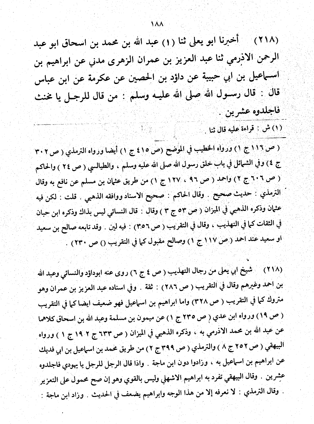 218 - حَدَّثَنَا عَبْدُ اللَّهِ بْنُ مُحَمَّدِ بْنِ إِسْحَاقَ أَبُو عَبْدِ الرَّحْمَنِ الْأَذْرَمِيُّ، حَدَّثَنَا عَبْدُ الْعَزِيزِ بْنُ عِمْرَانَ الزُّهْرِيُّ مَدَنِيٌّ عَنْ إِبْرَاهِيمَ بْنِ إِسْمَاعِيلَ بْنِ أَبِي حَبِيبَةَ، عَنْ دَاوُدَ بْنِ الْحُصَيْنِ، عَنْ عِكْرِمَةَ، عَنِ ابْنِ عَبَّاسٍ، قَالَ: قَالَ رَسُولُ اللَّهِ صَلَّى اللهُ عَلَيْهِ وَسَلَّمَ: " §مَنْ قَالَ لِرَجُلٍ: يَا مُخَنَّثُ، فَاجْلِدُوهُ عِشْرِينَ "