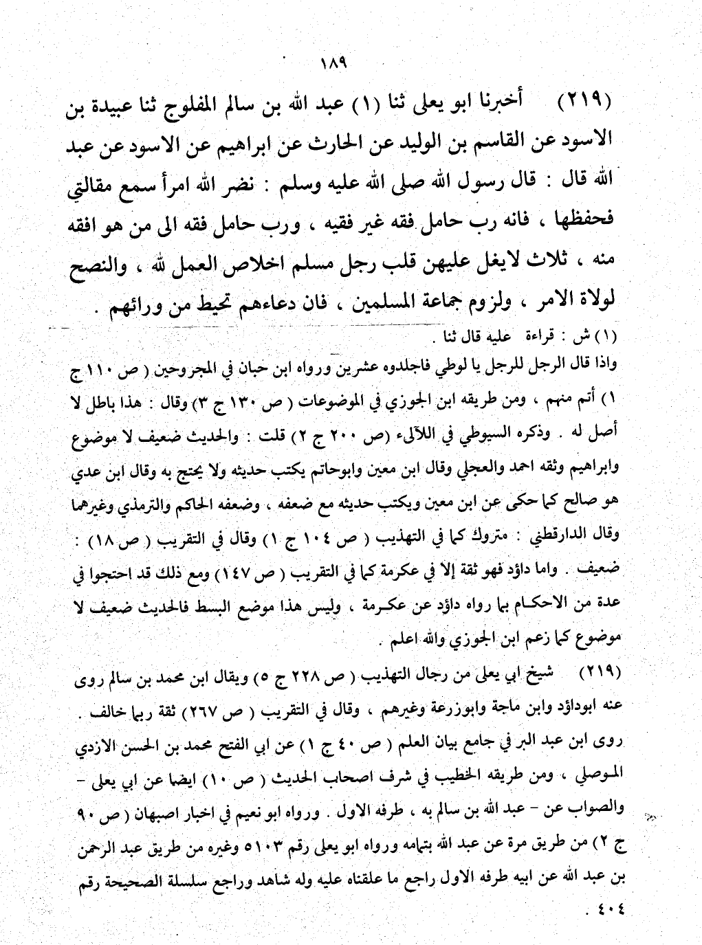 219 - حَدَّثَنَا عَبْدُ اللَّهِ بْنُ سَالِمٍ الْمَفْلُوجُ، حَدَّثَنَا عُبَيْدَةُ بْنُ الْأَسْوَدِ، عَنِ الْقَاسِمِ بْنِ الْوَلِيدِ، عَنِ الْحَارِثِ، عَنْ إِبْرَاهِيمَ، عَنِ الْأَسْوَدِ، عَنْ عَبْدِ اللَّهِ، قَالَ: قَالَ رَسُولُ اللَّهِ صَلَّى اللهُ عَلَيْهِ وَسَلَّمَ: " §نَضَّرَ اللَّهُ امْرَأً سَمِعَ مَقَالَتِي، فَحِفَظَهَا، فَإِنَّهُ رُبَّ حَامِلِ فِقْهٍ غَيْرِ فَقِيهٍ، وَرُبَّ حَامِلِ فِقْهٍ إِلَى مَنْ هُوَ أَفْقَهُ مِنْهُ. ثَلَاثٌ لَا يُغِلُّ عَلَيْهِنَّ قَلْبُ رَجُلٍ مُسْلِمٍ: إِخْلَاصُ الْعَمَلِ لِلَّهِ، وَالنُّصْحُ لِوُلَاةِ الْأَمْرِ، وَلُزُومُ جَمَاعَةِ الْمُسْلِمِينَ، فَإِنَّ دُعَاءَهُمْ يُحِيطُ مَنْ وَرَاءَهُمْ "