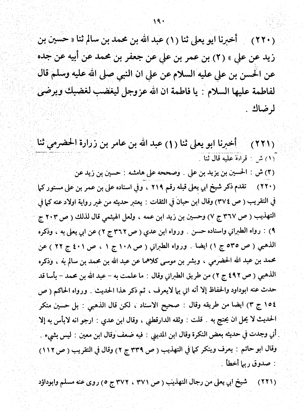 220 - حَدَّثَنَا عَبْدُ اللَّهِ بْنُ مُحَمَّدِ بْنِ سَالِمٍ، حَدَّثَنَا حُسَيْنُ بْنُ زَيْدٍ، عَنْ عَلِيِّ بْنِ عُمَرَ بْنِ عَلِيٍّ، عَنْ جَعْفَرِ بْنِ مُحَمَّدٍ، عَنْ أَبِيهِ، عَنْ جَدِّهِ، عَنِ الْحُسَيْنِ بْنِ عَلِيٍّ، عَلَيْهِ السَّلَامُ، عَنْ عَلِيٍّ، أَنَّ النَّبِيَّ صَلَّى اللهُ عَلَيْهِ وَسَلَّمَ قَالَ لِفَاطِمَةَ عَلَيْهَا السَّلَامُ: «يَا فَاطِمَةُ، إِنَّ §اللَّهَ عَزَّ وَجَلَّ يَغْضَبُ لِغَضَبِكِ، وَيَرْضَى لِرِضَاكِ»