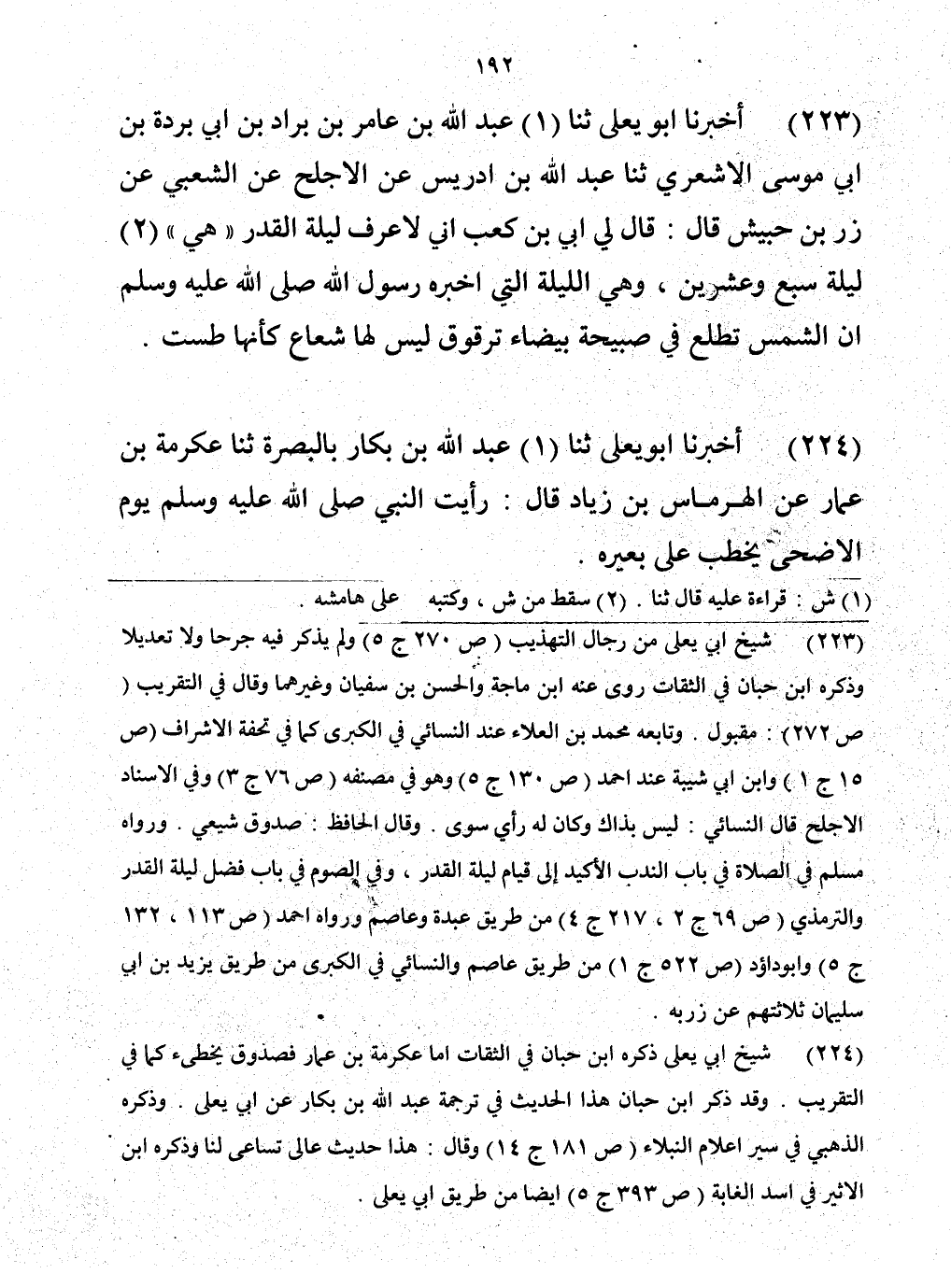 223 - حَدَّثَنَا عَبْدُ اللَّهِ بْنُ عَامِرِ بْنِ بَرَّادِ بْنِ أَبِي بُرْدَةَ بْنِ أَبِي مُوسَى الْأَشْعَرِيُّ، حَدَّثَنَا عَبْدُ اللَّهِ بْنُ إِدْرِيسَ، عَنِ الْأَجْلَحِ، عَنِ الشَّعْبِيِّ، عَنْ زِرِّ بْنِ حُبَيْشٍ، قَالَ: قَالَ لِي أُبَيُّ بْنُ كَعْبٍ: «إِنِّي لَأَعْرِفُ لَيْلَةَ الْقَدْرِ، هِيَ لَيْلَةُ سَبْعٍ وَعِشْرِينَ، وَهِيَ اللَّيْلَةُ الَّتِي أَخْبَرَنَا رَسُولُ اللَّهِ صَلَّى اللهُ عَلَيْهِ وَسَلَّمَ أَنَّ §الشَّمْسَ تَطْلُعُ فِي صَبِيحَتِهَا بَيْضَاءَ تَرَقْرَقُ، لَيْسَ لَهَا شُعَاعٌ، كَأَنَّهَا طَسْتٌ»
