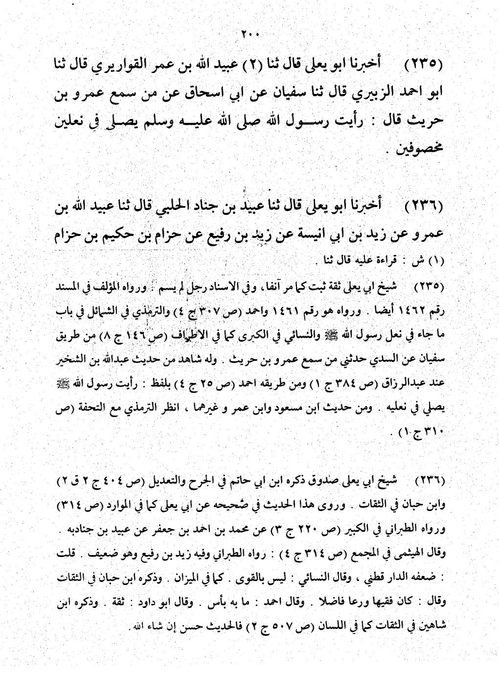 235 - حَدَّثَنَا عُبَيْدُ اللَّهِ بْنُ عُمَرَ الْقَوَارِيرِيُّ، قَالَ: حَدَّثَنَا أَبُو أَحْمَدَ الزُّبَيْرِيُّ، قَالَ: حَدَّثَنَا سُفْيَانُ، عَنْ أَبِي إِسْحَاقَ، عَنْ مَنْ، سَمِعَ عَمْرَو بْنَ حُرَيْثٍ، قَالَ: «رَأَيْتُ رَسُولَ اللَّهِ صَلَّى اللهُ عَلَيْهِ وَسَلَّمَ §يُصَلِّي فِي نَعْلَيْنِ مَخْصُوفَتَيْنِ»