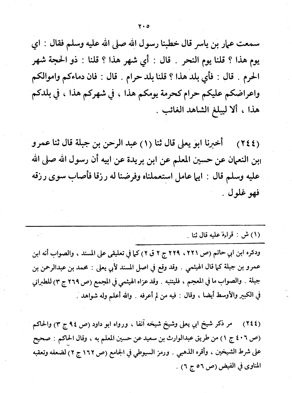 244 - حَدَّثَنَا عَبْدُ الرَّحْمَنِ بْنُ جَبَلَةَ، قَالَ: حَدَّثَنَا عَمْرُو بْنُ النُّعْمَانِ، عَنْ حُسَيْنٍ الْمُعَلِّمِ، عَنِ ابْنِ بُرَيْدَةَ، عَنْ أَبِيهِ، أَنَّ رَسُولَ اللَّهِ صَلَّى اللهُ عَلَيْهِ وَسَلَّمَ قَالَ: «§أَيُّمَا عَامِلٍ اسْتَعْمَلْنَاهُ، وَفَرَضْنَا لَهُ رِزْقًا، فَأَصَابَ سِوَى رِزْقِهِ، فَهُوَ غُلُولٌ»