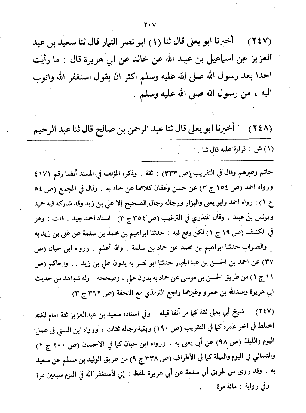247 - حَدَّثَنَا أَبُو نَصْرٍ التَّمَّارُ، قَالَ: حَدَّثَنَا سَعِيدُ بْنُ عَبْدِ الْعَزِيزِ، عَنْ إِسْمَاعِيلَ بْنِ عُبَيْدِ اللَّهِ، عَنْ خَالِدٍ، عَنْ أَبِي هُرَيْرَةَ، قَالَ: " مَا رَأَيْتُ أَحَدًا بَعْدَ رَسُولِ اللَّهِ صَلَّى اللهُ عَلَيْهِ وَسَلَّمَ أَكْثَرَ أَنْ يَقُولَ: «§أَسْتَغْفِرُ اللَّهَ، وَأَتُوبُ إِلَيْهِ» مِنْ رَسُولِ اللَّهِ صَلَّى اللهُ عَلَيْهِ وَسَلَّمَ "