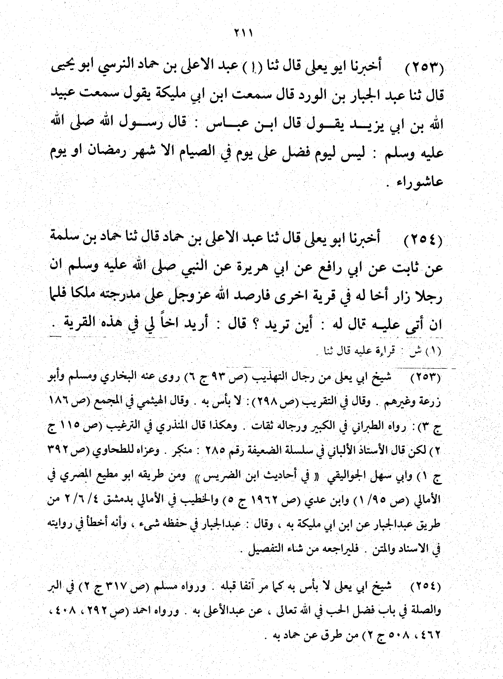 254 - حَدَّثَنَا عَبْدُ الْأَعْلَى بْنُ حَمَّادٍ، قَالَ: حَدَّثَنَا حَمَّادُ بْنُ سَلَمَةَ، عَنْ ثَابِتٍ، عَنْ أَبِي رَافِعٍ، عَنْ أَبِي هُرَيْرَةَ، عَنِ النَّبِيِّ صَلَّى اللهُ عَلَيْهِ وَسَلَّمَ: " إِنَّ رَجُلًا زَارَ أَخًا لَهُ فِي قَرْيَةٍ أُخْرَى، فَأَرْصَدَ اللَّهُ عَزَّ وَجَلَّ عَلَى مَدْرَجَتِهِ مَلَكًا، فَلَمَّا أَنْ أَتَى عَلَيْهِ قَالَ لَهُ: أَيْنَ تُرِيدُ؟ قَالَ: أُرِيدُ أَخًا لِي فِي هَذِهِ الْقَرْيَةِ. قَالَ: هَلْ لَهُ عَلَيْكَ مِنْ نِعْمَةٍ تَرُبُّهَا؟ قَالَ: لَا، غَيْرَ أَنِّي أُحِبُّهُ فِي اللَّهِ تَعَالَى. قَالَ: فَإِنِّي رَسُولُ اللَّهِ إِلَيْكَ. قَالَ: إِنَّ §اللَّهَ قَدْ أَحَبَّكَ كَمَا أَحْبَبْتَهُ فِيهِ "