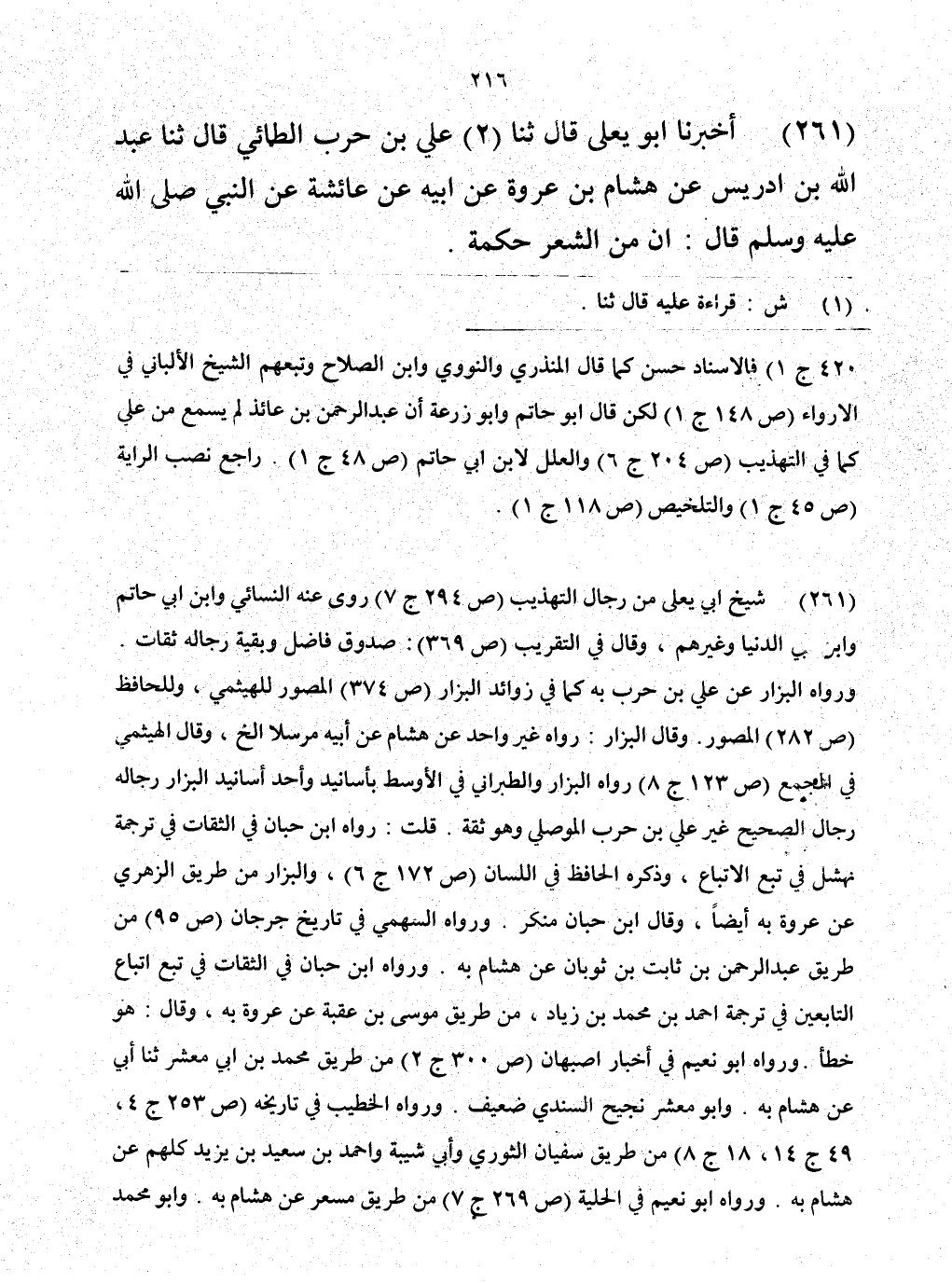 261 - حَدَّثَنَا عَلِيُّ بْنُ حَرْبٍ الطَّائِيُّ، قَالَ: حَدَّثَنَا عَبْدُ اللَّهِ بْنُ إِدْرِيسَ، عَنْ هِشَامِ بْنِ عُرْوَةَ، عَنْ أَبِيهِ، عَنْ عَائِشَةَ، عَنِ النَّبِيِّ صَلَّى اللهُ عَلَيْهِ وَسَلَّمَ قَالَ: «§إِنَّ مِنَ الشِّعْرِ حِكْمَةً»
