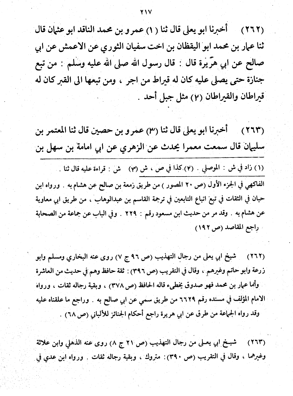 262 - حَدَّثَنَا عَمْرُو بْنُ مُحَمَّدٍ النَّاقِدُ أَبُو عُثْمَانَ، قَالَ: حَدَّثَنَا عَمَّارُ بْنُ مُحَمَّدٍ أَبُو الْيَقْظَانِ ابْنُ أُخْتِ، سُفْيَانَ الثَّوْرِيِّ، عَنِ الْأَعْمَشِ، عَنْ أَبِي صَالِحٍ، عَنْ أَبِي هُرَيْرَةَ، قَالَ: قَالَ رَسُولُ اللَّهِ صَلَّى اللهُ عَلَيْهِ وَسَلَّمَ: «§مَنْ تَبِعَ جَنَازَةً حَتَّى يُصَلِّيَ عَلَيْهَا، كَانَ لَهُ قِيرَاطٌ مِنْ أَجْرٍ، وَمَنْ تَبِعَهَا إِلَى الْقَبْرِ، كَانَ لَهُ قِيرَاطَانِ، وَالْقِيرَاطَانِ مِثْلُ جَبَلِ أُحُدٍ»
