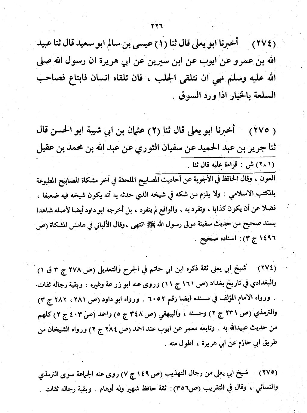 274 - حَدَّثَنَا عِيسَى بْنُ سَالِمٍ أَبُو سَعِيدٍ، قَالَ: حَدَّثَنَا عُبَيْدُ اللَّهِ بْنُ عَمْرٍو، عَنْ أَيُّوبَ، عَنِ ابْنِ سِيرِينَ، عَنْ أَبِي هُرَيْرَةَ، أَنَّ رَسُولَ اللَّهِ صَلَّى اللهُ عَلَيْهِ وَسَلَّمَ «§نَهَى أَنْ يُتَلَقَّى الْجَلَبُ، فَإِنْ تَلَقَّاهُ إِنْسَانٌ فَابْتَاعَ، فَصَاحِبُ السِّلْعَةِ بِالْخِيَارِ إِذَا وَرَدَ السُّوقَ»