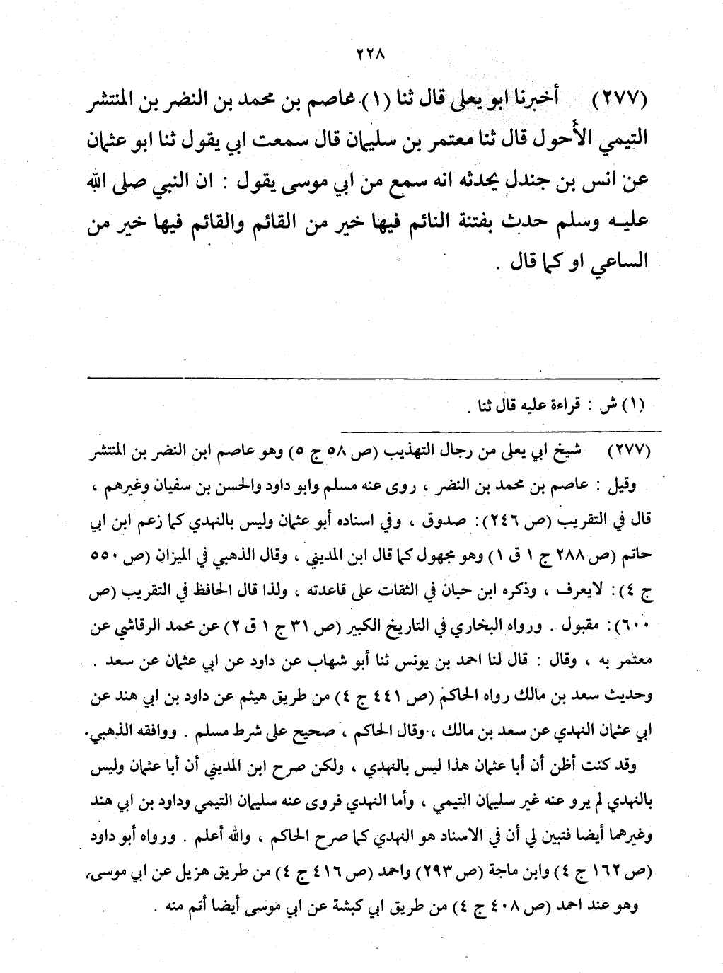 277 - حَدَّثَنَا عَاصِمُ بْنُ مُحَمَّدِ بْنِ النَّضْرِ بْنِ الْمُنْتَشِرِ التَّيْمِيُّ الْأَحْوَلُ، قَالَ: حَدَّثَنَا مُعْتَمِرُ بْنُ سُلَيْمَانَ، قَالَ: سَمِعْتُ أَبِي يَقُولُ: حَدَّثَنَا أَبُو عُثْمَانَ، عَنْ أَنَسِ بْنِ جَنْدَلٍ، يُحَدِّثُهُ أَنَّهُ سَمِعَ مِنْ أَبِي مُوسَى، يَقُولُ: «إِنَّ النَّبِيَّ صَلَّى اللهُ عَلَيْهِ وَسَلَّمَ حَدَّثَ بِفِتْنَةٍ، §النَّائِمُ فِيهَا خَيْرٌ مِنَ الْقَاعِدِ، وَالْقَاعِدُ فِيهَا خَيْرٌ مِنَ الْقَائِمِ، وَالْقَائِمُ فِيهَا خَيْرٌ مِنَ السَّاعِي. أَوْ كَمَا قَالَ»