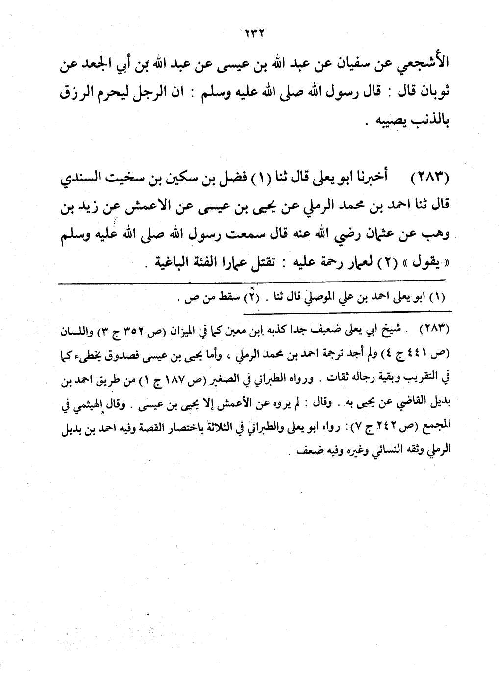 283 - حَدَّثَنَا فَضْلُ بْنُ سُكَيْنِ بْنِ سُحَيْتٍ السِّنْدِيُّ، قَالَ: حَدَّثَنَا أَحْمَدُ بْنُ مُحَمَّدٍ الرَّمْلِيُّ، عَنْ يَحْيَى بْنِ عِيسَى، عَنِ الْأَعْمَشِ، عَنْ زَيْدِ بْنِ وَهْبٍ، عَنْ عُثْمَانَ، رَضِيَ اللَّهُ عَنْهُ قَالَ: سَمِعْتُ رَسُولَ اللَّهِ صَلَّى اللهُ عَلَيْهِ وَسَلَّمَ يَقُولُ لِعَمَّارٍ رَحْمَةُ اللَّهِ عَلَيْهِ: «§تَقْتُلُ عَمَّارًا الْفِئَةُ الْبَاغِيَةُ»