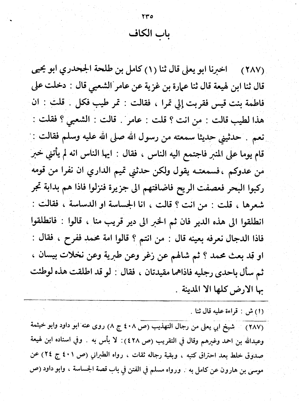 287 - حَدَّثَنَا كَامِلُ بْنُ طَلْحَةَ الْجَحْدَرِيُّ أَبُو يَحْيَى، قَالَ: حَدَّثَنَا ابْنُ لَهِيعَةَ، قَالَ: حَدَّثَنَا عُمَارَةُ بْنُ غَزِيَّةَ، عَنْ عَامِرٍ الشَّعْبِيِّ، قَالَ: دَخَلْتُ عَلَى فَاطِمَةَ بِنْتِ قَيْسٍ، فَقَرَّبَتْ إِلَيَّ تَمْرًا، فَقَالَتْ: تَمْرٌ طَيِّبٌ، فَكُلْ. قُلْتُ: إِنَّ هَذَا لَطَيِّبٌ. قَالَتْ: مَنْ أَنْتَ؟ قُلْتُ: عَامِرٌ. قَالَتِ: الشَّعْبِيُّ؟ فَقُلْتُ: نَعَمْ، حَدِّثِينِي حَدِيثًا سَمِعْتِهِ مِنْ رَسُولِ اللَّهِ صَلَّى اللهُ عَلَيْهِ وَسَلَّمَ. فَقَالَتْ: قَامَ يَوْمًا عَلَى الْمِنْبَرِ، فَاجْتَمَعَ إِلَيْهِ النَّاسُ، فَقَالَ: «يَا أَيُّهَا النَّاسُ، إِنَّهُ لَمْ يَأْتِنِي خَبَرٌ مِنْ عَدُوِّكُمْ» . فَسَمِعْتُهُ يَقُولُ: " وَلَكِنْ حَدَّثَنِي تَمِيمٌ الدَّارِيُّ أَنَّ نَفَرًا مِنْ قَوْمِهِ رَكِبُوا الْبَحْرَ، فَعَصَفَتِ الرِّيحُ، فَأَضَافَتْهُمْ إِلَى جَزِيرَةٍ، فَنَزَلُوا، فَإِذَا هُمْ بِدَابَّةٍ تَجُرُّ شَعَرَهَا، قُلْتُ: مَنْ أَنْتِ؟ قَالَتْ: §أَنَا الْجَسَّاسَةُ أَوِ الدَّسَّاسَةُ فَقَالَتِ: انْطَلِقُوا إِلَى هَذَا الدَّيْرِ، فَإِنَّ ثَمَّ الْخَبَرَ إِلَى دَيْرٍ قَرِيبٍ مِنَّا. قَالُوا: فَانْطَلَقْنَا، فَإِذَا الدَّجَّالُ نَعْرِفُهُ بِعَيْنِهِ، قَالَ: مَنْ أَنْتُمْ؟ قَالُوا: أُمَّةُ مُحَمَّدٍ، فَفَرِحَ، فَقَالَ: أَوَ قَدْ بُعِثَ مُحَمَّدٌ؟ ثُمَّ سَأَلَهُمْ عَنْ زُغَرَ، وَعَنْ طَبَرِيَّةَ، وَعَنْ نَخَلَاتِ بَيْسَانَ، ثُمَّ شَالَ بِإِحْدَى رِجْلَيْهِ، فَإِذَا هُمَا مُقَيَّدَتَانِ، فَقَالَ: لَوْ أُطْلِقَتْ هَذِهِ لَوَطِئْتُ بِهَا الْأَرْضَ كُلَّهَا إِلَّا الْمَدِينَةَ "