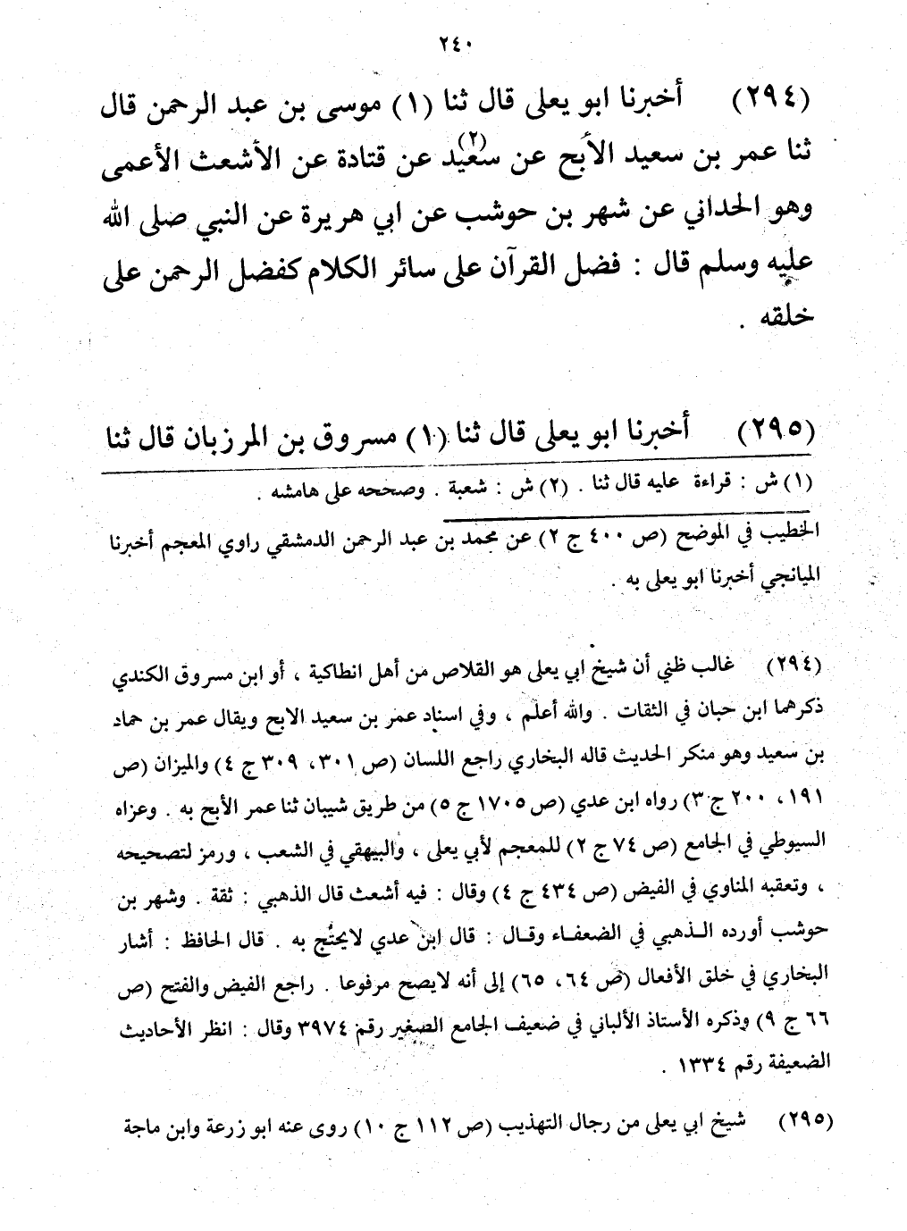 294 - حَدَّثَنَا مُوسَى بْنُ عَبْدِ الرَّحْمَنِ، قَالَ: حَدَّثَنَا عُمَرُ بْنُ سَعِيدٍ الْأَبَحُّ، عَنْ سَعِيدٍ، عَنْ قَتَادَةَ، عَنِ الْأَشْعَثِ الْأَعْمَى وَهُوَ الْحُدَّانِيُّ، عَنْ شَهْرِ بْنِ حَوْشَبٍ، عَنْ أَبِي هُرَيْرَةَ، عَنِ النَّبِيِّ صَلَّى اللهُ عَلَيْهِ وَسَلَّمَ قَالَ: «§فَضْلُ الْقُرْآنِ عَلَى سَائِرِ الْكَلَامِ كَفَضْلِ الرَّحْمَنِ عَلَى خَلْقِهِ»