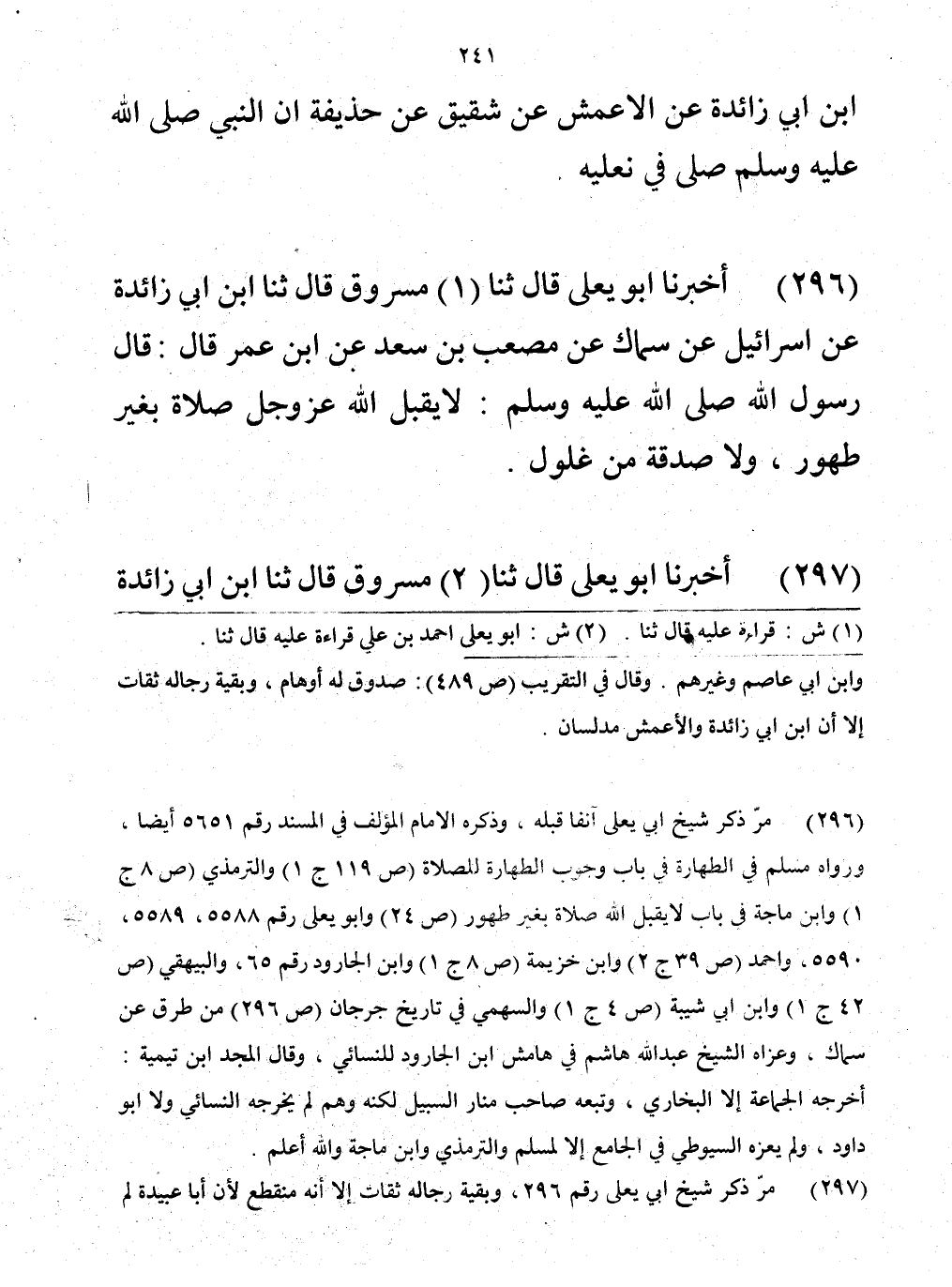 296 - حَدَّثَنَا مَسْرُوقٌ، قَالَ: حَدَّثَنَا ابْنُ أَبِي زَائِدَةَ، عَنْ إِسْرَائِيلَ، عَنْ سِمَاكٍ، عَنْ مُصْعَبِ بْنِ سَعْدٍ، عَنِ ابْنِ عُمَرَ: قَالَ رَسُولُ اللَّهِ صَلَّى اللهُ عَلَيْهِ وَسَلَّمَ: «§لَا يَقْبَلُ اللَّهُ عَزَّ وَجَلَّ صَلَاةً بِغَيْرِ طُهُورٍ، وَلَا صَدَقَةً مِنْ غُلُولٍ»