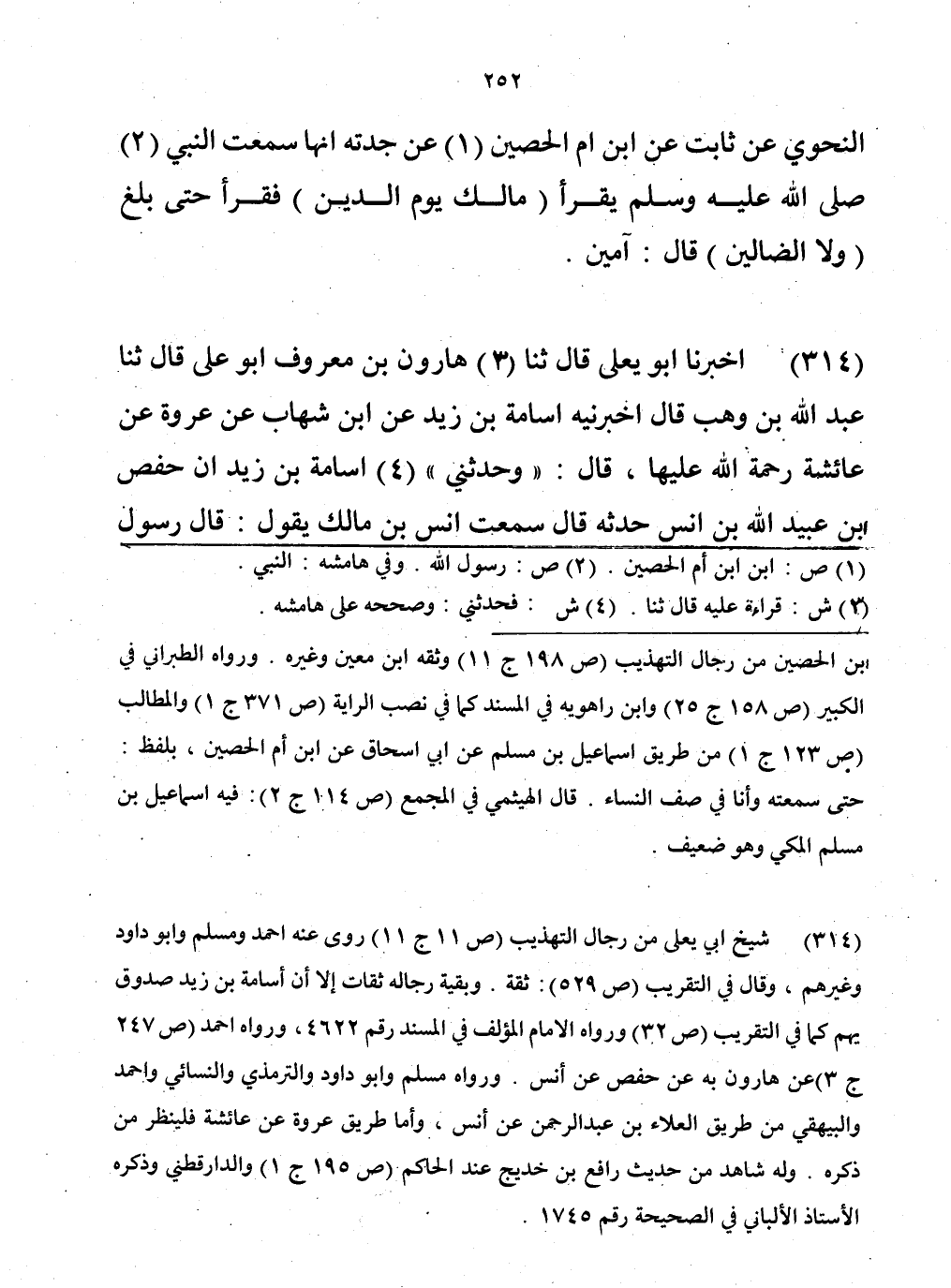314 - حَدَّثَنَا هَارُونُ بْنُ مَعْرُوفٍ أَبُو عَلِيٍّ، قَالَ: حَدَّثَنَا عَبْدُ اللَّهِ بْنُ وَهْبٍ، قَالَ: أَخْبَرَنِيهِ أُسَامَةُ بْنُ زَيْدٍ، عَنِ ابْنِ شِهَابٍ، عَنْ عُرْوَةَ، عَنْ عَائِشَةَ، رَحْمَةُ اللَّهِ عَلَيْهَا. قَالَ: وَحَدَّثَنِي أُسَامَةُ بْنُ زَيْدٍ، أَنَّ حَفْصَ بْنَ عُبَيْدِ اللَّهِ بْنِ أَنَسٍ، حَدَّثَهُ قَالَ: سَمِعْتُ أَنَسَ بْنَ مَالِكٍ، يَقُولُ: قَالَ رَسُولُ اللَّهِ صَلَّى اللهُ عَلَيْهِ وَسَلَّمَ: «§أَلَا أُخْبِرُكُمْ بِصَلَاةِ الْمُنَافِقِ؟ يَدَعُ الْعَصْرَ حَتَّى إِذَا كَانَ بَيْنَ قَرْنَيِ الشَّيْطَانِ أَوْ عَلَى قَرْنِ الشَّيْطَانِ قَامَ، فَنَقَرَهُنَّ كَنَقَرَاتِ الدِّيكِ، لَا يَذْكُرُ اللَّهَ فِيهِنَّ إِلَّا قَلِيلًا»