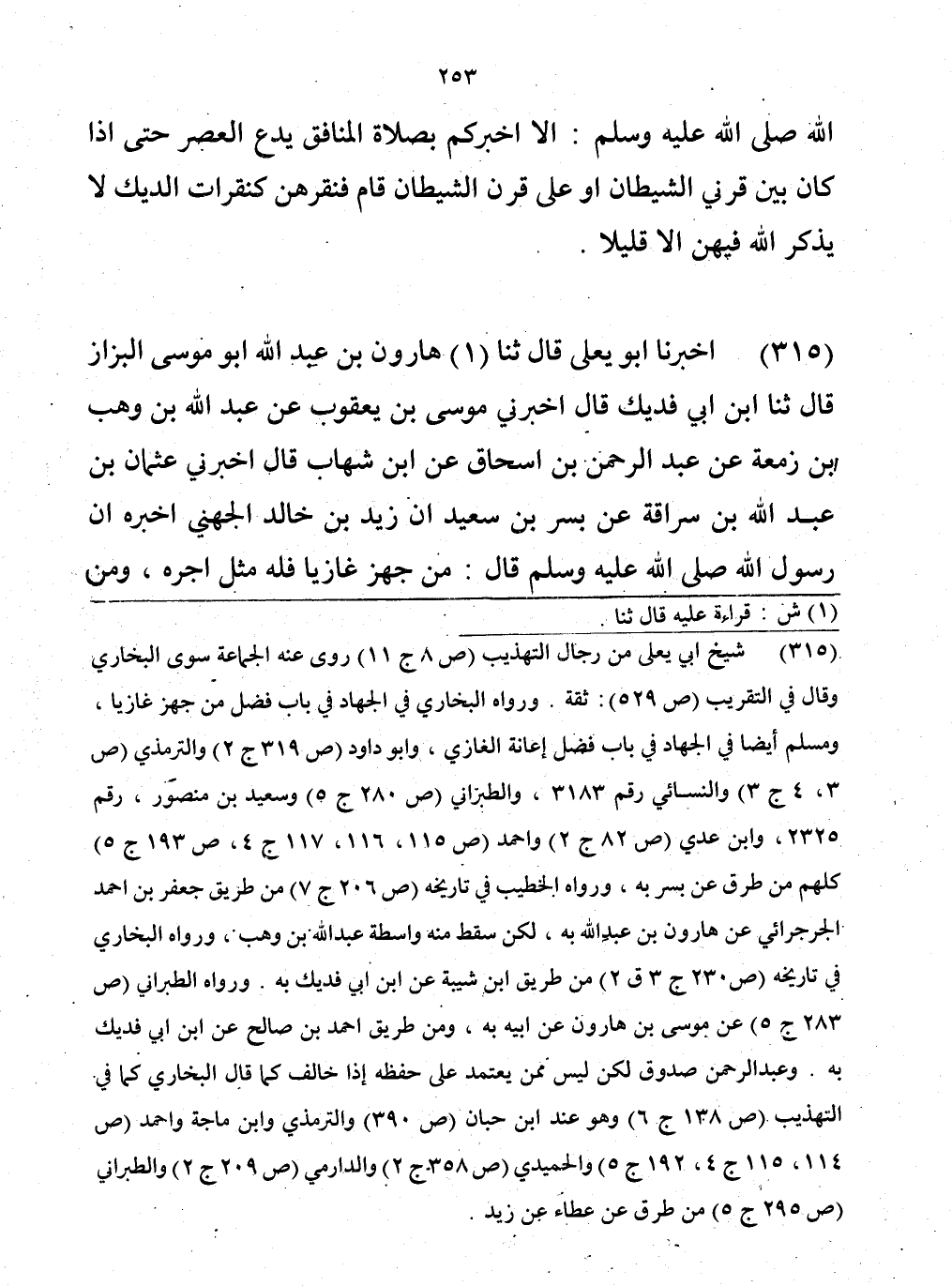 315 - حَدَّثَنَا هَارُونُ بْنُ عَبْدِ اللَّهِ أَبُو مُوسَى الْبَزَّازُ، قَالَ: حَدَّثَنَا ابْنُ أَبِي فُدَيْكٍ، قَالَ: أَخْبَرَنِي مُوسَى بْنُ يَعْقُوبِ بْنِ عَبْدِ اللَّهِ بْنِ وَهْبِ بْنِ زَمْعَةَ، عَنْ عَبْدِ الرَّحْمَنِ بْنِ إِسْحَاقَ، عَنِ ابْنِ شِهَابٍ، قَالَ: أَخْبَرَنِي عُثْمَانُ بْنُ عَبْدِ اللَّهِ بْنِ سُرَاقَةَ، عَنْ بُسْرِ بْنِ سَعِيدٍ، أَنَّ زَيْدَ بْنَ خَالِدٍ الْجُهَنِيَّ أَخْبَرَهُ أَنَّ رَسُولَ اللَّهِ صَلَّى اللهُ عَلَيْهِ وَسَلَّمَ قَالَ: «§مَنْ جَهَّزَ غَازِيًا فَلَهُ مِثْلُ أَجْرِهِ، وَمَنْ خَلَفَ غَازِيًا فِي أَهْلِهِ فَلَهُ مِثْلُ أَجْرِهِ» قَالَ ابْنُ شِهَابٍ: ثُمَّ أَخْبَرَنِيهِ بُسْرُ بْنُ سَعِيدٍ