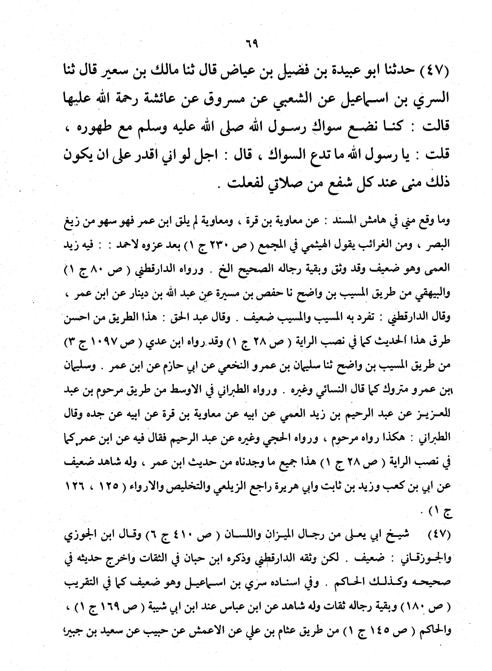 47 - حَدَّثَنَا أَبُو عُبَيْدَةَ بْنُ فُضَيْلِ بْنِ عِيَاضٍ، قَالَ: حَدَّثَنَا مَالِكُ بْنُ سُعَيْرٍ، قَالَ: حَدَّثَنَا السَّرِيُّ بْنُ إِسْمَاعِيلَ، عَنِ الشَّعْبِيِّ، عَنْ مَسْرُوقٍ، عَنْ عَائِشَةَ، رَحْمَةُ اللَّهِ عَلَيْهَا قَالَتْ: " كُنَّا §نَضَعُ سِوَاكَ رَسُولِ اللَّهِ صَلَّى اللهُ عَلَيْهِ وَسَلَّمَ مَعَ طَهُورِهِ. قُلْتُ: يَا رَسُولَ اللَّهِ، مَا تَدَعُ السِّوَاكَ؟ قَالَ: «أَجَلْ، لَوْ أَنِّي أَقْدِرُ عَلَى أَنْ يَكُونَ ذَلِكَ مِنِّي عِنْدَ كُلِّ شَفْعٍ مِنْ صَلَاتِي لَفَعَلْتُ»